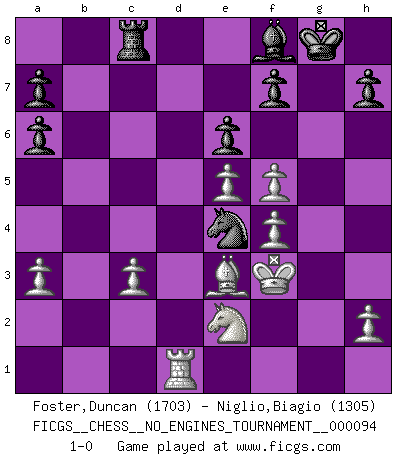 Last move : 1-0 2018 March 31 17:54:24 [Event "FICGS__CHESS__NO_ENGINES_TOURNAMENT__000094"] [Site "FICGS"] [Date "2017.11.12"] [Round "1"] [White "Foster,Duncan"] [Black "Niglio,Biagio"] [Result "1-0"] [WhiteElo "1703"] [BlackElo "1305"] 1.e4 d6 2.d4 Nf6 3.Nc3 g6 4.f4 Bg7 5.a3 O-O 6.Nf3 Na6 7.b4 c5 8.e5 Nh5 9.dxc5 dxc5 10.Qxd8 Rxd8 11.Bxa6 bxa6 12.bxc5 Bh6 13.Ne2 Ng7 14.Kf2 Bf5 15.c3 Ne6 16.Nfd4 Nxc5 17.Nxf5 gxf5 18.Be3 Rac8 19.Rhd1 Rxd1 20.Rxd1 Ne4+ 21.Kf3 e6 22.g4 Bf8 23.gxf5 1-0 Pirc : Austrian attack Kingside Castling by player Black (move 5) Player White won this chess game. Follow this game move after move (download)You can only get good at Chess if you love the game. (Bobby Fischer) Computer sind die einzigen Gegner, die nicht immer eine Ausrede auf Lager haben, wenn sie gegen mich verlieren. (Robert James Fischer) Yo no le temo a Spassky. Todos saben que yo soy el mejor. Uno no necesita un torneo para probarlo. (Bobby Fischer) Que feriez-vous si vous étiez en train de jouer aux échecs et que la fin du monde arrive ? Je continuerais à jouer. (Saint Borromée) Statistics can be made to prove anything - even the truth. (Author unknown)