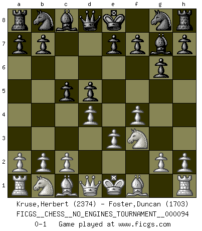 Last move : 0-1 2017 November 18 13:59:1 [Event "FICGS__CHESS__NO_ENGINES_TOURNAMENT__000094"] [Site "FICGS"] [Date "2017.11.12"] [Round "1"] [White "Kruse,Herbert"] [Black "Foster,Duncan"] [Result "0-1"] [WhiteElo "2374"] [BlackElo "1703"] 1.f4 d5 2.Nf3 g6 3.e3 Bg7 4.d4 c5 0-1 Bird's Opening Player Black won this chess game. Follow this game move after move (download)A thorough understanding of the typical mating continuations makes the most complicated sacrificial combinations leading up to them not only not difficult, but almost a matter of course. (Siegbert Tarrasch) Ein Teil des Fehlers ist immer korrekt. (Savielly Grigorievitsch Tartakower) Dejen al perfeccionista jugar por correo. (Yasser Seirawan) Les Echecs représentent une sphère d'idées créatrices basée sur la volonté des deux protagonistes. (Smyslov) Never was anything great achieved without danger. (Niccolo Machiavelli)