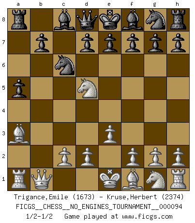 Last move : 1/2-1/2 2017 November 14 12:23:54 [Event "FICGS__CHESS__NO_ENGINES_TOURNAMENT__000094"] [Site "FICGS"] [Date "2017.11.12"] [Round "1"] [White "Trigance,Emile"] [Black "Kruse,Herbert"] [Result "1/2-1/2"] [WhiteElo "1673"] [BlackElo "2374"] 1.b4 c6 2.e3 Qb6 3.a3 a5 4.b5 cxb5 5.Nc3 b4 6.axb4 Qxb4 7.Ba3 Qb6 8.Nd5 Qd8 9.Qb1 Nc6 1/2-1/2 Polish : Outflank variation This chess game ended in a draw. Follow this game move after move (download)The enormous mental resilience, without which no Chess player can exist, was so much taken up by Chess that he could never free his mind of this game. (Albert Einstein) Das Schach ist nichts für kleine Geister, es beansprucht einen vollen Mann, der sich nicht sklavisch an das Überlieferte hält, sondern selbständig die Tiefen des Spiels zu ergründen sucht. (Wilhelm Steinitz) Me gusta decir que Bobby Fischer fue el mejor jugador que jamás haya existido. Pero lo que hizo de Fischer un genio, fue su habilidad de mezclar una frescura y pragmatismo Americano con ideas Rusas acerca de la estrategia. (Bruce Pandolfini) Les Echecs ont trois composantes : le temps, l'espace et le matériel en dernier. (Mikhail Tal) There's always a bigger fish. (Qui-Gon Jinn in Star Wars ep.1)