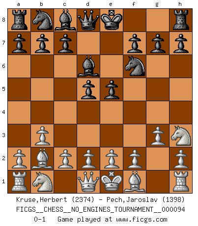 Last move : 0-1 2017 December 22 19:50:13 [Event "FICGS__CHESS__NO_ENGINES_TOURNAMENT__000094"] [Site "FICGS"] [Date "2017.11.12"] [Round "1"] [White "Kruse,Herbert"] [Black "Pech,Jaroslav"] [Result "0-1"] [WhiteElo "2374"] [BlackElo "1398"] 1.Nh3 d5 2.g3 Nf6 3.b3 e5 4.Bb2 Bd6 0-1 Amar (Paris) Opening Player Black won this chess game. Follow this game move after move (download)The Pawns are the soul of the game. (Francois Andre Danican Philidor) Lisa Lane, amerikanische Schachmeisterin, hatte Fischer einmal als stärksten lebenden Spieler bezeichnet. Antwort: Das ist richtig, aber Lisa Lane ist eigentlich nicht in der Lage, das zu beurteilen. (Robert James Fischer) Las ideas audaces son como las piezas del Ajedrez que avanzan hacia adelante. Ellas pueden ser vencidas, pero también pueden iniciar una partida victoriosa. (Goethe) Le système Elo représente seulement une moyenne. Il est simplement un indicateur de votre stabilité. (Anatoli Karpov) Life is the sum of all your choices. (Albert Camus)