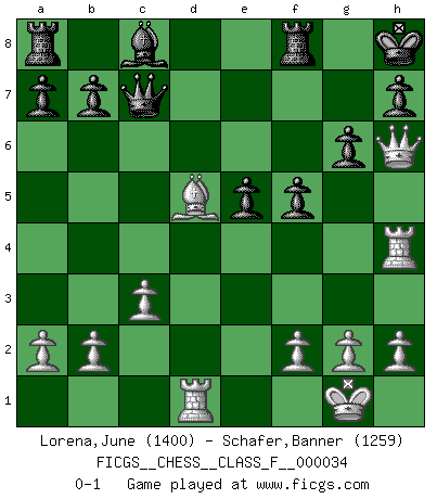 Last move : 0-1 2007 September 1 0:31:42 [Event "FICGS__CHESS__CLASS_F__000034"] [Site "FICGS"] [Date "2007.04.16"] [Round "1"] [White "Lorena,June"] [Black "Schafer,Banner"] [Result "0-1"] [WhiteElo "1400"] [BlackElo "1259"] 1.d4 c5 2.Nf3 e6 3.e4 Nc6 4.Be3 cxd4 5.Nxd4 Bb4+ 6.Nd2 Nf6 7.Bd3 Nxd4 8.Bxd4 d5 9.c3 dxe4 10.Nxe4 Nxe4 11.Bxe4 Ba5 12.O-O O-O 13.Qd3 g6 14.Qe3 f5 15.Qh6 Rf7 16.Bf3 Bb6 17.Rad1 Bxd4 18.Rxd4 Qb6 19.Rfd1 Rf8 20.Rb4 Qc7 21.Rh4 e5 22.Bd5+ Kh8 0-1 This chess game has been lost on time (started : 2007.04.16 19:53:40) Old Benoni defense Kingside Castling by player White (move 12) Kingside Castling by player Black (move 12) Player Black won this chess game. Follow this game move after move (download)When your house is on fire, you can't be bothered with the neighbors. Or, as we say in Chess, if your King is under attack you don't worry about losing a Pawn on the Queen's side. (Gary Kasparov) Fischer ist das größte Genie, das je vom Schachhimmel heruntergestiegen ist. (Mikhail Nekhemyevich Tal) Alguna parte de un error es siempre correcto. (Savielly Tartakover) Toute estimation doit être constamment réévaluée. (Jacob Estrin) Drag your thoughts away from your troubles... by the ears, by the heels, or any other way you can manage it. (Mark Twain)