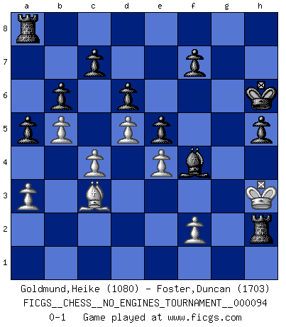 Last move : 0-1 2018 March 19 17:33:20 [Event "FICGS__CHESS__NO_ENGINES_TOURNAMENT__000094"] [Site "FICGS"] [Date "2017.11.12"] [Round "1"] [White "Goldmund,Heike"] [Black "Foster,Duncan"] [Result "0-1"] [WhiteElo "1080"] [BlackElo "1703"] 1.b4 b6 2.Bb2 Bb7 3.e3 d6 4.Nf3 e5 5.c4 Nc6 6.a3 Nf6 7.Be2 Be7 8.Qb3 O-O 9.O-O h6 10.d3 Qd7 11.Nbd2 Nd8 12.e4 Ne6 13.Nh4 Nf4 14.Bf3 Nh7 15.Nf5 Bf6 16.Bg4 Qd8 17.Nf3 h5 18.Bh3 Nxh3+ 19.gxh3 Ng5 20.Nxg5 Bxg5 21.Kh1 Qf6 22.Rg1 g6 23.h4 Bf4 24.Nh6+ Bxh6 25.Qc2 Qxh4 26.Rg2 Kh7 27.Rag1 a5 28.b5 Bc8 29.Qe2 Bh3 30.Rg3 Bf4 31.Rf3 g5 32.d4 Bf1 33.Rh3 Bxe2 34.Rxh4 Bf3+ 35.Rg2 Bxg2+ 36.Kxg2 gxh4 37.d5 Rg8+ 38.Kh3 Rg1 39.Kxh4 Kh6 40.Bc3 Rg2 41.Kh3 Rxh2+ 0-1 Polish (Sokolsky) opening Kingside Castling by player Black (move 8) Kingside Castling by player White (move 9) Player Black won this chess game. Follow this game move after move (download)Daring ideas are like Chess men moved forward. They may be beaten, but they may start a winning game. (Johann Wolfgang von Goethe) Jede Eröffnung ist gut genug um gespielt zu werden, wenn nur ihr Ruf schlecht genug ist. (Savielly Grigorievitsch Tartakower) La vida es como un juego de Ajedrez, cambiando con cada movimiento. (Proverbio Chino) Les sacrifices démontrent seulement que quelqu'un a gaffé. (Savielly Tartacover) You cannot beat a roulette table unless you steal money from it. (Albert Einstein)