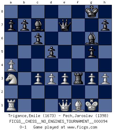Last move : 0-1 2018 March 14 19:42:46 [Event "FICGS__CHESS__NO_ENGINES_TOURNAMENT__000094"] [Site "FICGS"] [Date "2017.11.12"] [Round "1"] [White "Trigance,Emile"] [Black "Pech,Jaroslav"] [Result "0-1"] [WhiteElo "1673"] [BlackElo "1398"] 1.b4 e5 2.Bb2 Bxb4 3.f4 Nc6 4.fxe5 f6 5.Nf3 fxe5 6.e3 Nf6 7.Nxe5 Nxe5 8.Bxe5 O-O 9.Be2 Qe7 10.Bf4 d5 11.O-O Ne4 12.c3 Ba5 13.Qe1 g5 14.Bg3 Rxf1+ 15.Bxf1 Bf5 16.a4 Rf8 17.Na3 c6 18.h3 Nxg3 19.Qxg3 Bc7 20.Qe1 Be4 21.d3 Bg6 22.g3 Rf3 0-1 Polish (Sokolsky) opening Kingside Castling by player Black (move 8) Kingside Castling by player White (move 11) Player Black won this chess game. Follow this game move after move (download)A player surprised is half beaten. (Proverb) Ich bin stolz ein Bulgare zu sein. (Veselin Topalov) Todos los Maestros de Ajedrez fueron un día unos principiantes. (Chernev) Roi des jeux et jeu des rois, les échecs portent en eux un sentiment d'infini. Ils donnent à celui qui s'est efforcé d'en approfondir les arcanes l'impression de n'être pas à la mesure de l'homme; en fait, ils constituent un résumé de l'univers, un microcosme, et figurent cette grande échelle qui, dans les plans de la lumière descend jusqu'à la matière, qui des abîmes insondables remonte jusqu'en l'infini de Dieu. (Pyrame) However beautiful the strategy, you should occasionally look at the results. (Winston Churchill)