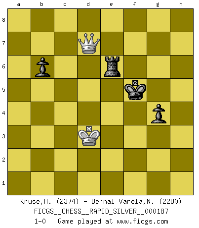 Last move : 1-0 2018 February 22 19:21:29 [Event "FICGS__CHESS__RAPID_SILVER__000187"] [Site "FICGS"] [Date "2017.11.13"] [Round "1"] [White "Kruse,Herbert"] [Black "Bernal Varela,Nelson"] [Result "1-0"] [WhiteElo "2374"] [BlackElo "2280"] 1.e4 e6 2.d4 d5 3.Nc3 Nf6 4.Bg5 Be7 5.e5 Nfd7 6.Bxe7 Qxe7 7.f4 O-O 8.Nf3 c5 9.Nb5 Nc6 10.c3 f6 11.h4 cxd4 12.cxd4 Nb6 13.Qd2 Bd7 14.h5 Qb4 15.b3 a6 16.Nc3 fxe5 17.fxe5 Rac8 18.Rc1 h6 19.Bd3 a5 20.Ne2 a4 21.Rc3 Na5 22.Rc5 Qxd2+ 23.Kxd2 Ra8 24.Rc3 Nc6 25.Ke3 Nb4 26.Bb1 axb3 27.axb3 Ra3 28.Rhc1 Nc8 29.Nh4 Ne7 30.Nf4 Nec6 31.Nhg6 Rfa8 32.Rf1 Na2 33.Bxa2 Rxa2 34.g3 Rh2 35.Rf3 Re8 36.g4 Nb4 37.Rf2 Rxf2 38.Kxf2 Nc6 39.Ke3 Rb8 40.Nd3 b6 41.Rc2 Be8 42.Ndf4 Bd7 43.Rxc6 Bxc6 44.Ne7+ Kf7 45.Nxc6 Rc8 46.Nb4 Rc3+ 47.Ke2 Rc8 48.Kd2 Ke7 49.Nbxd5+ exd5 50.Nxd5+ Kf7 51.Ne3 g6 52.hxg6+ Kxg6 53.Kd3 Rh8 54.Nd5 Ra8 55.Ne7+ Kf7 56.Nf5 Kg6 57.Ke4 Ra1 58.d5 Re1+ 59.Kf4 Rf1+ 60.Kg3 Rg1+ 61.Kf3 h5 62.e6 hxg4+ 63.Kf2 Rb1 64.d6 Rb2+ 65.Ke3 Rxb3+ 66.Kd4 Kxf5 67.d7 Rb4+ 68.Kc3 Re4 69.d8Q Re3+ 70.Kc4 Re4+ 71.Kd3 Rxe6 72.Qd7 1-0 French : Classical, Steinitz variation Kingside Castling by player Black (move 7) 10 pieces endgame at move 52 : White KNPPPP , Black KRPP WHITE : King + 1 Knight 4 Pawns BLACK : King + 1 Rook 2 Pawns 9 pieces endgame at move 62 : White KNPPP , Black KRPP WHITE : King + 1 Knight 3 Pawns BLACK : King + 1 Rook 2 Pawns 8 pieces endgame at move 65 : White KNPP , Black KRPP WHITE : King + 1 Knight 2 Pawns BLACK : King + 1 Rook 2 Pawns 7 pieces endgame at move 66 : White KPP , Black KRPP WHITE : King + 2 Pawns BLACK : King + 1 Rook 2 Pawns Promotion Queen by player White (move 69) 6 pieces endgame at move 71 : White KQ , Black KRPP WHITE : King + 1 Queen BLACK : King + 1 Rook 2 Pawns Player White won this chess game. Follow this game move after move (download)The chessboard is the world, the pieces are the phenomena of the Universe, the rules of the game are what we call the laws of Nature and the player on the other side is hidden from us. (Thomas Huxley) Ich kenne keine einzige Person, die behaupten würde, Garri Kasparow sei ein guter Mensch (Nigel Short) Un jugador que es sorprendido, esta derrotado a medias. (Proverbio) Le jeu d'échecs est comme rejeté hors du temps. (Antoine de Saint-Exupéry) O divine art of subtlety and secrecy! Through you we learn to be invisible, through you inaudible and hence we can hold the enemy's fate in our hands. (Sun Tzu)