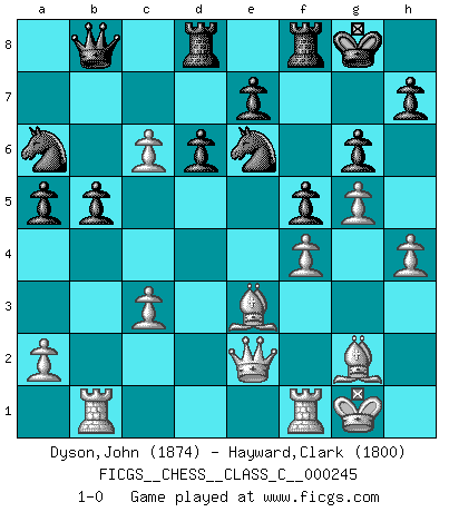 Last move : 1-0 2018 May 26 0:8:2 [Event "FICGS__CHESS__CLASS_C__000245"] [Site "FICGS"] [Date "2017.11.15"] [Round "1"] [White "Dyson,John"] [Black "Hayward,Clark"] [Result "1-0"] [WhiteElo "1874"] [BlackElo "1800"] 1.Nf3 Nf6 2.c4 g6 3.g3 Bg7 4.Bg2 O-O 5.O-O d6 6.Nc3 c6 7.d4 Bf5 8.Ne1 Qb6 9.e4 Bg4 10.Qd3 a5 11.Be3 Na6 12.h3 Bd7 13.e5 Ne8 14.Rd1 Rd8 15.f4 Qc7 16.Nf3 Qc8 17.g4 f5 18.g5 Nec7 19.d5 Nb4 20.Qe2 cxd5 21.cxd5 b5 22.e6 Be8 23.Nd4 Qb8 24.h4 Nba6 25.Nc6 Bxc6 26.dxc6 Bxc3 27.bxc3 Nxe6 28.Rb1 1-0 This chess game has been lost on time (started : 2017.11.15 17:4:0) Reti Opening Kingside Castling by player Black (move 4) Kingside Castling by player White (move 5) Player White won this chess game. Follow this game move after move (download)Blessed be the memory of him who gave the world this immortal game. (A. G. Gardiner) Der Schachmeister von Heute braucht Courage, einen Killerinstinkt, Ausdauer und Arroganz. (Larry Evans) De todos mis libros Rusos, la defensa contiene y difunde el 'calor' mas grande que pudiese verse extraño al observar lo supremamente abstracto que el Ajedrez supuestamente es. (Vladimir Nabokov) RxDa4 pat (...) Every vice is only an exaggeration of a necessary and virtuous function. (Ralph Waldo Emerson, Journals 1936)