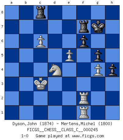 Last move : 1-0 2018 May 2 10:49:2 [Event "FICGS__CHESS__CLASS_C__000245"] [Site "FICGS"] [Date "2017.11.15"] [Round "1"] [White "Dyson,John"] [Black "Mertens,Michel"] [Result "1-0"] [WhiteElo "1874"] [BlackElo "1800"] 1.Nf3 e6 2.c4 Nf6 3.Nc3 d5 4.d4 c5 5.g3 cxd4 6.Nxd4 e5 7.Nf3 d4 8.Nxe5 Qd6 9.Qa4+ Nbd7 10.Nb5 Qb4+ 11.Qxb4 Bxb4+ 12.Bd2 Bxd2+ 13.Kxd2 O-O 14.Nxd7 Bxd7 15.Nxd4 Rad8 16.e3 Ne4+ 17.Ke1 Rfe8 18.Bg2 Bg4 19.Bxe4 Rxe4 20.Kd2 Bf3 21.Rhe1 h5 22.b4 h4 23.Kc3 Bg2 24.f3 Re5 25.g4 g6 26.e4 a5 27.a3 Rd6 28.h3 Re8 29.c5 axb4+ 30.axb4 Rd7 31.Re2 Red8 32.Rd2 g5 33.b5 Bxh3 34.c6 bxc6 35.bxc6 Rc8 36.Rh2 Bxg4 37.fxg4 f6 38.Rf2 Rf7 39.Raf1 Kg7 40.e5 1-0 Reti Opening Kingside Castling by player Black (move 13) Player White won this chess game. Follow this game move after move (download)There is only one thing Fischer does in Chess without pleasure: to lose ! (Boris Spassky) Ich habe Putins Aufstieg an die Macht beobachtet und seine Politik, die demokratischen Institutionen meines Landes zu zerstören. (Garry Kasparov) El Peón aislado arroja penumbra sobre todo el tablero. (Aaron Nimzovich) Même un GMI sait rarement calculer sur plus de cinq coups une attaque à sacrifices. (Rudolf Spielmann) Luck never made a man wise. (Seneca, Letters to Lucilius)