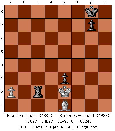 Last move : 0-1 2018 March 3 21:25:55 [Event "FICGS__CHESS__CLASS_C__000245"] [Site "FICGS"] [Date "2017.11.15"] [Round "1"] [White "Hayward,Clark"] [Black "Sternik,Ryszard"] [Result "0-1"] [WhiteElo "1800"] [BlackElo "1925"] 1.d4 Nf6 2.Nf3 e6 3.c4 d5 4.Nc3 c6 5.e3 Nbd7 6.Qc2 Bd6 7.Bd3 O-O 8.O-O dxc4 9.Bxc4 b5 10.Be2 Bb7 11.e4 e5 12.dxe5 Nxe5 13.Nd4 Neg4 14.g3 Bxg3 15.hxg3 Qxd4 16.Qd1 Qxd1 17.Rxd1 Rfe8 18.f3 Ne5 19.Be3 h6 20.Rd6 a5 21.Bxh6 Nh5 22.Bf4 Ng6 23.Be3 Nxg3 24.Kf2 Nxe2 25.Nxe2 Rad8 26.Bc5 Rxd6 27.Bxd6 Rd8 28.Rd1 Nf8 29.e5 c5 30.Ke3 Re8 31.f4 f6 32.Nc3 Ng6 33.Nxb5 fxe5 34.f5 Nh4 35.Bxc5 Nxf5+ 36.Kf2 Rc8 37.b4 axb4 38.Bxb4 e4 39.Nd6 e3+ 40.Ke1 Nxd6 41.Rxd6 Bf3 42.Kf1 Rc1+ 43.Be1 Bc6 44.Rxc6 Rxc6 45.Ke2 Rc2+ 0-1 Queen's pawn game Kingside Castling by player Black (move 7) Kingside Castling by player White (move 8) 10 pieces endgame at move 40 : White KRBP , Black KRBNPP WHITE : King + 1 Rook 1 Bishop 1 Pawn BLACK : King + 1 Rook 1 Bishop 1 Knight 2 Pawns 9 pieces endgame at move 41 : White KRBP , Black KRBPP WHITE : King + 1 Rook 1 Bishop 1 Pawn BLACK : King + 1 Rook 1 Bishop 2 Pawns 8 pieces endgame at move 44 : White KRBP , Black KRPP WHITE : King + 1 Rook 1 Bishop 1 Pawn BLACK : King + 1 Rook 2 Pawns 7 pieces endgame at move 44 : White KBP , Black KRPP WHITE : King + 1 Bishop 1 Pawn BLACK : King + 1 Rook 2 Pawns Player Black won this chess game. Follow this game move after move (download)Spassky will not be psyched out by Fischer. (Mike Goodall) Ein Springer auf f6 gegen die eigene Rochadestellung ist schlimmer als ein rostiger Nagel im Knie. (Efim Bogoljubov) Fischer sacrificó virtualmente todo lo que la mayoría de nosotros los 'debiles' (término que él usa) valoramos, respetamos y apreciamos por el amor de un astuto, a menudo hermoso tablero de juego, por el privilegio ambivalente de ser su mas grande maestro. (Paul Kollar) A chaque perte on perd un peu de soi. (Joël Lautier) When you don't know what to do, walk fast and look worried. (Anonymous)