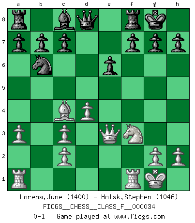 Last move : 0-1 2007 July 24 12:31:29 [Event "FICGS__CHESS__CLASS_F__000034"] [Site "FICGS"] [Date "2007.04.16"] [Round "1"] [White "Lorena,June"] [Black "Holak,Stephen"] [Result "0-1"] [WhiteElo "1400"] [BlackElo "1046"] 1.d4 d5 2.e4 e6 3.Nc3 Nf6 4.Be3 dxe4 5.f3 Bb4 6.a3 Bxc3+ 7.bxc3 Nd5 8.Qd2 Nxe3 9.Qxe3 exf3 10.Nxf3 Nd7 11.Bc4 O-O 12.O-O Nb6 0-1 This chess game has been lost on time (started : 2007.04.16 19:53:40) Blackmar gambit Kingside Castling by player Black (move 11) Kingside Castling by player White (move 12) Player Black won this chess game. Follow this game move after move (download)It is always better to sacrifice your opponent's men. (Savielly Tartakower) Er war ein guter Schachspieler, aber ich kann Leute nicht ausstehen, die 'Heil Hitler' rufen (Über Alexander Aljechin). (Miguel Najdorf) El Ajedrez es el juego mas altamente simbólico, pero las agresiones estan por lo tanto aún mas francamente representadas en la partida. Tal vez comenzo como un juego de guerra; Algo como la representación de una batalla en miniatura entre las fuerzas de dos reinos. (Karl Meninger) Toutes choses étant égales, c'est la conviction qui gagne. Alliée à une volonté de vaincre, elle sert de détonateur, suscite des idées, disperse les doutes et aide à penser clairement. (Robert Fischer) To send light into the darkness of men's hearts - such is the duty of the artist. (Schumann)