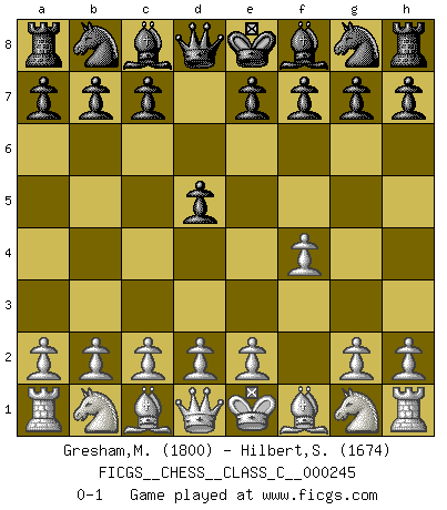 Last move : 0-1 2017 December 30 21:43:27 [Event "FICGS__CHESS__CLASS_C__000245"] [Site "FICGS"] [Date "2017.11.15"] [Round "1"] [White "Gresham,Matthew"] [Black "Hilbert,Stephan J."] [Result "0-1"] [WhiteElo "1800"] [BlackElo "1674"] 1.f4 d5 0-1 This chess game has been lost on time (started : 2017.11.15 17:4:0) Bird's Opening Player Black won this chess game. Follow this game move after move (download)Though most people love to look at the games of the great attacking masters, some of the most successful players in history have been the quiet positional players. They slowly grind you down by taking away your space, tying up your pieces, and leaving you with virtually nothing to do ! (Yasser Seirawan) Frage des Reporters: -Welche besonderen Umstände rechtfertigen das Anhalten der Uhren während einer Turnierpartie? Antwort: -Einen Fotographen zu strangulieren. (Siegbert Tarrasch) Un Peón pasado aumenta su poder a medida de que el número de piezas en el tablero disminuye. (Capablanca) Comme les marins qui ont mille raisons différentes d'aller en mer, les joueurs d'échecs en ont tout autant avant de s'installer devant une table et jouer... (Vincent Bertignac, philosophe) Tomorrow's what you make of it. (Horatio Caine, C.S.I. Miami)