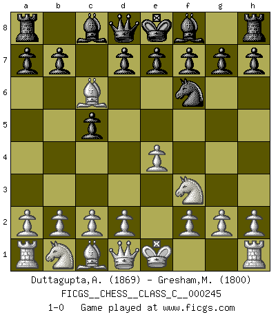 Last move : 1-0 2017 December 25 21:12:18 [Event "FICGS__CHESS__CLASS_C__000245"] [Site "FICGS"] [Date "2017.11.15"] [Round "1"] [White "Duttagupta,Aniruddha"] [Black "Gresham,Matthew"] [Result "1-0"] [WhiteElo "1869"] [BlackElo "1800"] 1.e4 c5 2.Nf3 Nc6 3.Bb5 Nf6 4.Bxc6 1-0 This chess game has been lost on time (started : 2017.11.15 17:4:0) Sicilian : Nimzovich-Rossolimo attack (without ...d6) Player White won this chess game. Follow this game move after move (download)Chess is a matter of delicate judgment, knowing when to punch and how to duck. (Bobby Fischer) Ich erzeugte keinen Neid, da mich die Schachspieler als Musiker und die Musiker als Schachspieler betrachteten. (Mark Taimanov) Yo siempre he tenido un ligero sentimiento de lástima por una persona que no tiene conocimiento del Ajedrez. (Siegbert Tarrasch) Avec des compensations pour le matériel en plus... (Anonyme) Being number two sucks. (Andre Agassi)