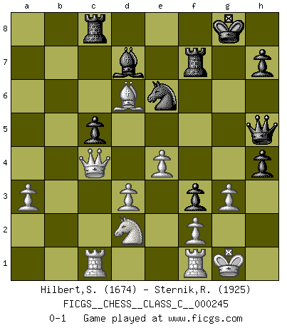 Last move : 0-1 2018 June 9 1:45:19 [Event "FICGS__CHESS__CLASS_C__000245"] [Site "FICGS"] [Date "2017.11.15"] [Round "1"] [White "Hilbert,Stephan J."] [Black "Sternik,Ryszard"] [Result "0-1"] [WhiteElo "1674"] [BlackElo "1925"] 1.a3 e5 2.c4 Nf6 3.Nc3 Nc6 4.e3 d5 5.cxd5 Nxd5 6.Qc2 f5 7.b4 Nb6 8.Bb2 Bd6 9.Nf3 O-O 10.d3 Be6 11.Be2 Qf6 12.O-O a6 13.Rac1 g5 14.Nd2 Qh6 15.g3 Rf7 16.Bf3 Raf8 17.b5 axb5 18.Nxb5 f4 19.Nxd6 cxd6 20.Bxc6 Rc8 21.Qb1 bxc6 22.Bxe5 Nd7 23.Bxd6 f3 24.h4 gxh4 25.Bf4 Qh5 26.Qb4 c5 27.Qa4 Bd5 28.e4 Be6 29.Qa6 Nf8 30.Bd6 Bd7 31.Qc4 Ne6 0-1 This chess game has been lost on time (started : 2017.11.15 17:4:0) Anderssen's Opening Kingside Castling by player Black (move 9) Kingside Castling by player White (move 12) Player Black won this chess game. Follow this game move after move (download)Not all artists are Chess players, but all Chess players are artists. (Marcel Duchamp) Das Spiel gibt uns die Genugtuung, die das Leben uns versagt. (Emanuel Lasker) Repentinamente, me resultaba obvio en mi analisis que yo había pasado por alto lo que Fischer había visto en el tablero con la mas grande facilidad. (Mikhail Botvinnik) Aidez vos pièces, elles vous aideront. (Paul Morphy) It's not a bug - it's an undocumented feature. (Anonymous)