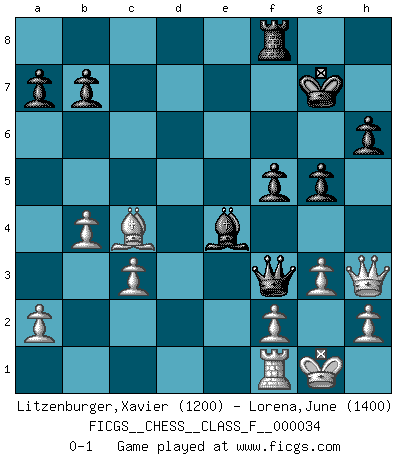 Last move : 0-1 2007 May 18 10:55:15 [Event "FICGS__CHESS__CLASS_F__000034"] [Site "FICGS"] [Date "2007.04.16"] [Round "1"] [White "Litzenburger,Xavier"] [Black "Lorena,June"] [Result "0-1"] [WhiteElo "1200"] [BlackElo "1400"] 1.e4 e5 2.Nf3 Nc6 3.Bc4 Nd4 4.c3 Nxf3+ 5.Qxf3 Nf6 6.d4 Bd6 7.Bg5 h6 8.Bh4 g5 9.Bg3 O-O 10.dxe5 Bxe5 11.Bxe5 Ne8 12.Nd2 d6 13.Bd4 c5 14.Be3 Nf6 15.Rd1 Bg4 16.Qg3 Bxd1 17.O-O Bc2 18.Qh3 Kg7 19.e5 Ne4 20.Nxe4 Bxe4 21.exd6 Qxd6 22.b4 f5 23.Bxc5 Qf4 24.g3 Qf3 25.Bxf8+ Rxf8 0-1 King's pawn game Kingside Castling by player Black (move 9) Kingside Castling by player White (move 17) Player Black won this chess game. Follow this game move after move (download)Without error there can be no brilliancy. (Emanuel Lasker) Ich hatte Angst gegen einen russischen Großmeister zu verlieren, und er befürchtete gegen einen kleinen Jungen zu verlieren. (über ein Remis gegen Juri Awerbach). (Robert James Fischer) Puntos débiles o agujeros en la posición de tu oponente deben de ser ocupados por piezas, no Peones. (Siegbert Tarrasch) Des combinaisons [dans le jeu d'échecs] pareilles à des mélodies. Je crois entendre pour ainsi dire la musique des coups... (Vladimir Nabokov) The various flowers seem good to different people. (Chinese proverb)