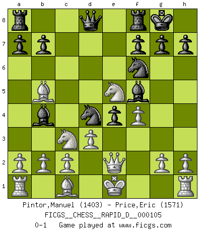 Last move : 0-1 2017 December 5 20:14:42 [Event "FICGS__CHESS__RAPID_D__000105"] [Site "FICGS"] [Date "2017.11.21"] [Round "1"] [White "Pintor,Manuel"] [Black "Price,Eric"] [Result "0-1"] [WhiteElo "1403"] [BlackElo "1571"] 1.e4 e5 2.f4 d5 3.exd5 e4 4.Nc3 Nf6 5.Bb5+ c6 6.dxc6 Nxc6 7.Qe2 Bf5 8.d3 Bb4 9.Nf3 O-O 10.Ne5 Nd4 0-1 KGD : Falkbeer, 3...e4 Kingside Castling by player Black (move 9) Player Black won this chess game. Follow this game move after move (download)The Chess pieces are the block alphabet which shapes thoughts; and these thoughts, although making a visual design on the chessboard, express their beauty abstractly, like a poem. (Marcel Duchamp) In Buenos Aires ist es nicht mein vorrangiges Ziel ein starkes Turnier zu organisieren, sondern ein Turnier für Gentlemen. Ich würde nie Kamsky einladen. Ich mag keine Probleme. (Miguel Najdorf) Preferería tener un Peón que un dedo. (Reuben Fine) Toutes les manuvres exécutées sur une colonne ouverte ont pour but ultime l'intrusion définitive sur la septième ou la huitième rangée, en plein cur de la position ennemie. (Aaron Nimzovitch) Bobby never cared about money, though. His only desire was to prove that his choices were correct: He wanted chess to be important because he was a chess player, and he wanted to be important. Bobby knew money was important, but he didn't have a clue why, outside of clothes and status. The only way he could accomplish what he wanted was to fight for a lot of money. Once he got it, he gave it away. He did not know how to spend it. And once he'd become champion, after, essentially, sacrificing his life for it, he didn't know how to spend his time. (Bob Wade)