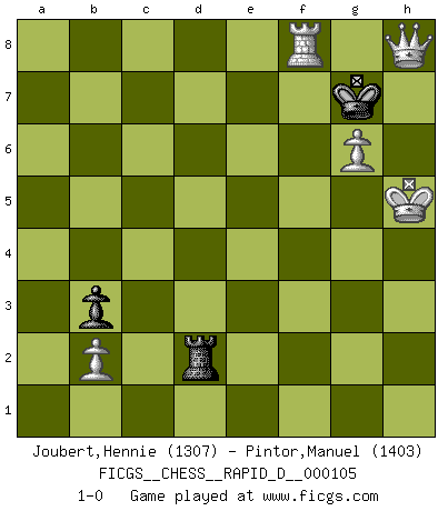Last move : 1-0 2018 January 4 8:15:50 [Event "FICGS__CHESS__RAPID_D__000105"] [Site "FICGS"] [Date "2017.11.21"] [Round "1"] [White "Joubert,Hennie"] [Black "Pintor,Manuel"] [Result "1-0"] [WhiteElo "1307"] [BlackElo "1403"] 1.e4 e5 2.Nf3 Nc6 3.Bc4 Bc5 4.d4 exd4 5.c3 Qf6 6.O-O d6 7.Bg5 Qg6 8.cxd4 Nxd4 9.Nxd4 Bxd4 10.Qxd4 Qxg5 11.Kh1 Qf6 12.Qd2 Nh6 13.Nc3 O-O 14.Rac1 c6 15.f4 Ng4 16.h3 Qh4 17.Kg1 Nf6 18.Qxd6 Nh5 19.Qd3 Nxf4 20.Qf3 Ne6 21.Rcd1 Ng5 22.Qf4 Qxf4 23.Rxf4 Be6 24.Bd3 Rad8 25.h4 Nxe4 26.Rxe4 Bf5 27.Re3 Bxd3 28.Rexd3 Rxd3 29.Rxd3 a5 30.Kf2 b5 31.Rd6 Rc8 32.Ne4 f6 33.Nc5 Kf7 34.Kf3 Ke7 35.Rd7+ Ke8 36.Rxg7 Kf8 37.Rxh7 Kg8 38.Rd7 a4 39.Kf4 Re8 40.Ne4 Kf8 41.Rd6 c5 42.Rxf6+ Kg7 43.Rf5 Rd8 44.Ke3 Rd1 45.Rxc5 Re1+ 46.Kf2 Rxe4 47.g3 Rb4 48.Rc2 Kg6 49.Kg2 Kh5 50.Kh3 Kg6 51.g4 Kh6 52.h5 Kg5 53.Kg3 Kh6 54.Kh4 Kg7 55.Kg5 Kh7 56.Rg2 Rc4 57.Rf2 Kg7 58.h6+ Kg8 59.Kh5 b4 60.g5 b3 61.axb3 axb3 62.Rf3 Rb4 63.Rf5 Rd4 64.g6 Rd2 65.h7+ Kh8 66.Rf8+ Kg7 67.h8Q+ 1-0 Giuoco Piano Kingside Castling by player White (move 6) Kingside Castling by player Black (move 13) 10 pieces endgame at move 46 : White KRPPPP , Black KRPP WHITE : King + 1 Rook 4 Pawns BLACK : King + 1 Rook 2 Pawns 9 pieces endgame at move 61 : White KRPPPP , Black KRP WHITE : King + 1 Rook 4 Pawns BLACK : King + 1 Rook 1 Pawn 8 pieces endgame at move 61 : White KRPPP , Black KRP WHITE : King + 1 Rook 3 Pawns BLACK : King + 1 Rook 1 Pawn Promotion Queen by player White (move 67) Player White won this chess game. Follow this game move after move (download)A sacrifice is best refuted by accepting it. (Wilhelm Steinitz) Schach ist gnadenlos. Du mußt bereit sein zu töten. (Nigel Short) El Ajedrez es en su esencia, un juego. En su forma, un arte. Y en su ejecución, una ciencia. (Baron Tassilo) Botvinnik disait en comparant les échecs à la musique: Il existe une science dont le but est l'étude de l'acoustique et des sons. Mais il y a aussi un art qui se sert de l'océan des sons : c'est la musique. De toute évidence, il en est de même pour la pensée. La logique est l'étude des lois de la réflexion et les échecs reflètent, en tant qu'art, le côté logique de la réflexion, sous la forme d'images artistiques... Extrait de Fischer - Spassky, Reykjavik 1972 par Alexander & F. Wyndham (Ed. Solar), p 37. A proverb is a short sentence based on long experience. (Miguel de Cervantes)