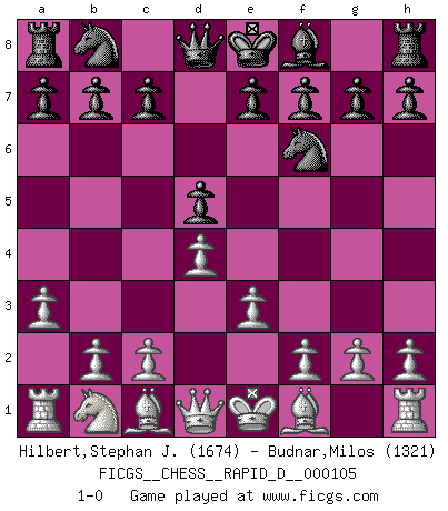 Last move : 1-0 2017 December 30 21:43:27 [Event "FICGS__CHESS__RAPID_D__000105"] [Site "FICGS"] [Date "2017.11.21"] [Round "1"] [White "Hilbert,Stephan J."] [Black "Budnar,Milos"] [Result "1-0"] [WhiteElo "1674"] [BlackElo "1321"] 1.a3 d5 2.Nf3 Bg4 3.Ne5 Nf6 4.Nxg4 Nxg4 5.e3 Nf6 6.d4 1-0 This chess game has been lost on time (started : 2017.11.21 12:32:11) Anderssen's Opening Player White won this chess game. Follow this game move after move (download)No price is too great for the scalp of the enemy King. (Koblentz) Wenn Du nicht kämpfst, um anderen etwas zu beweisen, sondern nur für Dich selbst, dann bist du fast unbesiegbar. (Garry Kasparov) El Ajedrez es una manera fabulosa para que los niños aprendan a autovalorarse y a autoestimarse. (Saudin Robovic) J'apprécie les joueurs d'est-indienne, c'est grâce à eux que je nourris ma famille depuis tant d'années. (Petrosian) He who defends everything defends nothing. (Frederick the Great)