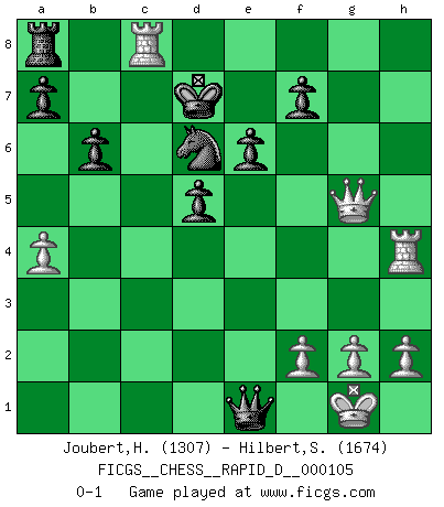 Last move : 0-1 2018 January 16 8:50:30 [Event "FICGS__CHESS__RAPID_D__000105"] [Site "FICGS"] [Date "2017.11.21"] [Round "1"] [White "Joubert,Hennie"] [Black "Hilbert,Stephan J."] [Result "0-1"] [WhiteElo "1307"] [BlackElo "1674"] 1.e4 b6 2.d4 Bb7 3.c4 Bxe4 4.Nc3 Bb7 5.Nf3 e6 6.Be2 Bb4 7.Bd2 Nf6 8.O-O O-O 9.a3 Bxc3 10.Bxc3 Ne4 11.Qc2 Nxc3 12.bxc3 Nc6 13.Rab1 Na5 14.Rb5 Bxf3 15.Bxf3 Nxc4 16.Rh5 g6 17.Rh3 d5 18.Qc1 Qf6 19.a4 c5 20.Rd1 cxd4 21.Rxd4 Rfc8 22.Rdh4 h5 23.Bxh5 gxh5 24.Rxh5 Kf8 25.Rf3 Qg6 26.Rh6 Qe4 27.Rf4 Qe5 28.Rfh4 Nd6 29.R6h5 Qxc3 30.Rh8+ Ke7 31.Qg5+ Kd7 32.Rxc8 Qe1+ 0-1 Owen defense Kingside Castling by player White (move 8) Kingside Castling by player Black (move 8) Player Black won this chess game. Follow this game move after move (download)When you see a good move, look for a better one. (Emanuel Lasker) Man wirke der falschen Auffassung entgegen, als ob jeder Zug Unmittelbares zu leisten habe; auch Werte- und Ruhezüge haben ihre Existenzberechtigung. (Aaron Nimzowitsch) No puedes jugar al Ajedrez si eres de corazón noble. (Proverbio Francés) Une platitude souvent récitée à propos des Echecs est qu'une des choses les plus difficiles à réaliser est de gagner une position gagnante. Cela ne manque pas de sens mais, pour ma part, j'ai toujours trouvé plus difficile de gagner une position perdante. (Tim Krabbe) Convictions are more dangerous enemies of truth than lies. (Friedrich Nietzsche)