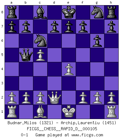 Last move : 0-1 2018 January 14 17:52:24 [Event "FICGS__CHESS__RAPID_D__000105"] [Site "FICGS"] [Date "2018.01.02"] [Round "1"] [White "Budnar,Milos"] [Black "Archip,Laurentiu"] [Result "0-1"] [WhiteElo "1321"] [BlackElo "1451"] 1.e4 c5 2.Nf3 g6 3.d4 Bg7 4.dxc5 Nc6 5.Bb5 Qa5+ 6.Nc3 Bxc3+ 7.Nd2 Bxd2+ 8.Qxd2 Qxb5 0-1 Sicilian : Hungarian variation Player Black won this chess game. Follow this game move after move (download)We must make sure that Chess will not be like a dead language, very interesting, but for a very small group. (Sytze Faber) Den Ruhm habe ich schon, jetzt brauche ich noch das Geld. (Wilhelm Steinitz) Hasta este punto, las blancas han seguido un análisis bien conocido. Pero ahora el hace un error fatal: empieza a usar su propia cabeza. (Siegbert Tarrasch) On peut tirer plus d'utilité d'une partie perdue que de 100 parties gagnées. (Capablanca) There are 10 types of people in this world: those who understand binary and those who don't. (Anonymous)