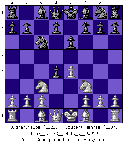 Last move : 0-1 2017 December 30 9:39:21 [Event "FICGS__CHESS__RAPID_D__000105"] [Site "FICGS"] [Date "2017.11.21"] [Round "1"] [White "Budnar,Milos"] [Black "Joubert,Hennie"] [Result "0-1"] [WhiteElo "1321"] [BlackElo "1307"] 1.e4 c5 2.Nc3 e6 3.Nf3 Nc6 4.d4 cxd4 0-1 This chess game has been lost on time (started : 2017.11.21 12:32:11) Sicilian : Closed Player Black won this chess game. Follow this game move after move (download)A bad day of Chess is better than any good day at work. (Anonymous) Ein Buch ist ein Spiegel; wenn ein Affe hineinsieht, so kann kein Apostel heraus gucken. (Georg Christoph Lichtenberg) Cada Peón es una Reina en potencia. (James Mason) Toutes les manuvres exécutées sur une colonne ouverte ont pour but ultime l'intrusion définitive sur la septième ou la huitième rangée, en plein cur de la position ennemie. (Aaron Nimzovitch) If you are good, you will be assigned all the work. If you are really good, you will get out of it. (Dan Rotaru)