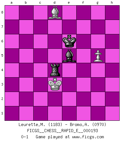 Last move : 0-1 2017 November 27 16:32:51 [Event "FICGS__CHESS__RAPID_E__000193"] [Site "FICGS"] [Date "2017.11.22"] [Round "1"] [White "Leurette,Marc-Antoine"] [Black "Bromo,Alexis"] [Result "0-1"] [WhiteElo "1183"] [BlackElo "0970"] 1.e4 e5 2.Nf3 Nc6 3.Bc4 h6 4.d4 d6 5.dxe5 Nxe5 6.Nxe5 dxe5 7.Qxd8+ Kxd8 8.O-O Be6 9.Bxe6 fxe6 10.Nc3 Nf6 11.Be3 c6 12.a3 Bd6 13.Rfd1 Ke7 14.f3 b6 15.b4 Rad8 16.Rab1 Rhf8 17.a4 Nh5 18.a5 Nf4 19.axb6 axb6 20.b5 c5 21.Na4 Rb8 22.c4 Ne2+ 23.Kf2 Nd4 24.Rd3 Ra8 25.Nc3 g5 26.h3 Rg8 27.Rbd1 h5 28.g4 h4 29.Ne2 Ra2 30.Bd2 Kf6 31.Nxd4 exd4 32.Kf1 e5 33.Bc1 Rga8 34.R1d2 Ra1 35.Rd1 R8a2 36.Ke1 Rc2 37.Bd2 Rxd1+ 38.Kxd1 Rxc4 39.Ra3 Bb8 40.Ra6 Bc7 41.Ra7 Bd8 42.Ra8 Bc7 43.Rc8 Bd6 44.Rc6 Ke6 45.Rxb6 Ra4 46.Ke2 c4 47.Bxg5 Ra2+ 48.Kd1 c3 49.Rc6 Kd7 50.Bxh4 Bb4 51.Bg5 d3 52.Rc4 Ra1+ 53.Bc1 c2+ 54.Rxc2 dxc2+ 55.Kxc2 Bc5 56.Bb2 Rh1 57.Bxe5 Rxh3 58.Kc3 Rxf3+ 59.Kc4 Bb6 60.Kd5 Rd3+ 61.Kc4 Rd1 62.g5 Rg1 63.Bf6 Ke6 64.e5 Rg4+ 65.Kb3 Bd4 66.b6 Bxb6 67.Kc3 Bd4+ 68.Kd3 Bxe5 69.Bd8 Rd4+ 0-1 King's pawn game Kingside Castling by player White (move 8) 10 pieces endgame at move 57 : White KBPPPPP , Black KRB WHITE : King + 1 Bishop 5 Pawns BLACK : King + 1 Rook 1 Bishop 9 pieces endgame at move 57 : White KBPPPP , Black KRB WHITE : King + 1 Bishop 4 Pawns BLACK : King + 1 Rook 1 Bishop 8 pieces endgame at move 58 : White KBPPP , Black KRB WHITE : King + 1 Bishop 3 Pawns BLACK : King + 1 Rook 1 Bishop 7 pieces endgame at move 66 : White KBPP , Black KRB WHITE : King + 1 Bishop 2 Pawns BLACK : King + 1 Rook 1 Bishop 6 pieces endgame at move 68 : White KBP , Black KRB WHITE : King + 1 Bishop 1 Pawn BLACK : King + 1 Rook 1 Bishop Player Black won this chess game. Follow this game move after move (download)Pawns are born free, yet they are everywhere in chains. (Rick Kennedy) Gott hat gewollt, dass ich Champion werde. (Surab Azmajparaschvili) No es una movida, aún la mejor movida que tu debas buscar, sino un plan comprensible. (Eugene Znosko-Borovsky) A chaque perte on perd un peu de soi. (Joël Lautier) I have opinions of my own - strong opinions - but I don't always agree with them. (George Bush)