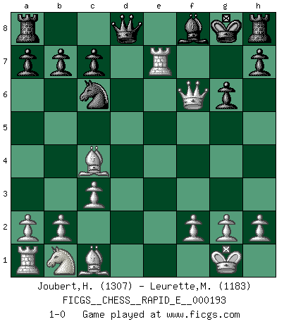 Last move : 1-0 2017 November 30 14:58:11 [Event "FICGS__CHESS__RAPID_E__000193"] [Site "FICGS"] [Date "2017.11.22"] [Round "1"] [White "Joubert,Hennie"] [Black "Leurette,Marc-Antoine"] [Result "1-0"] [WhiteElo "1307"] [BlackElo "1183"] 1.e4 e5 2.Nf3 Nc6 3.Bc4 Nf6 4.d4 exd4 5.O-O d6 6.c3 d5 7.exd5 Nxd5 8.Nxd4 Be6 9.Nxe6 fxe6 10.Re1 Kf7 11.Qh5+ g6 12.Qf3+ Kg7 13.Rxe6 Nde7 14.Qf6+ Kg8 15.Rxe7 1-0 Two knights defense Kingside Castling by player White (move 5) Player White won this chess game. Follow this game move after move (download)I won't play with you anymore. You have insulted my friend. - When an opponent cursed himself for a blunder. (Miguel Najdorf) In Buenos Aires ist es nicht mein vorrangiges Ziel ein starkes Turnier zu organisieren, sondern ein Turnier für Gentlemen. Ich würde nie Kamsky einladen. Ich mag keine Probleme. (Miguel Najdorf) Las piezas de Ajedrez son los bloques del alfabeto que moldean los pensamientos; y esos pensamientos, aunque hagan un diseño visual en el tablero, expresan abstractamente su belleza como un poema. (Marcel Duchamp) Aux échecs, l'amour-propre est satisfait quand on remporte la victoire, mais il n'y a pas de honte à être battu. (Benjamin Franklin) You think that education is too expensive ? Try ignorance. (Derek Bok)