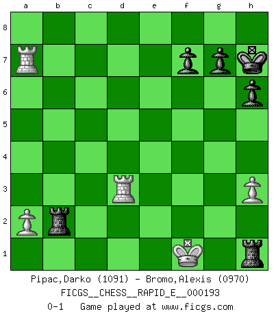 Last move : 0-1 2017 December 2 7:59:21 [Event "FICGS__CHESS__RAPID_E__000193"] [Site "FICGS"] [Date "2017.11.22"] [Round "1"] [White "Pipac,Darko"] [Black "Bromo,Alexis"] [Result "0-1"] [WhiteElo "1091"] [BlackElo "0970"] 1.e4 e5 2.Nf3 Nc6 3.Bb5 d6 4.h3 Bd7 5.Nc3 a6 6.Ba4 b5 7.Bb3 h6 8.Bd5 Rb8 9.Bxc6 Bxc6 10.d3 Nf6 11.O-O Be7 12.Nh4 Nxe4 13.Nf5 Nxc3 14.bxc3 Bf6 15.d4 Be4 16.Ne3 Bg6 17.Ba3 O-O 18.Nd5 c6 19.Nxf6+ Qxf6 20.Qe2 Rfe8 21.Rfd1 exd4 22.Qd2 c5 23.cxd4 cxd4 24.Qxd4 Qxd4 25.Rxd4 Bxc2 26.Rxd6 a5 27.Rc1 b4 28.Rxc2 bxa3 29.Rc3 Rb2 30.Rxa3 R8e2 31.Rxa5 Rxf2 32.Rd3 Rxg2+ 33.Kf1 Rh2 34.Ra8+ Kh7 35.Ra7 Rh1+ 0-1 Ruy Lopez : Old Steinitz defense Kingside Castling by player White (move 11) Kingside Castling by player Black (move 17) Player Black won this chess game. Follow this game move after move (download)The combination player thinks forward; he starts from the given position, and tries the forceful moves in his mind. (Emanuel Lasker) Es gibt keine einzige Frau, der ich nicht einen Springer vorgeben könnte und trotzdem gewänne. (Robert James Fischer) Vive, pierde y aprende al observar a tu oponente como ganar. (Amber Steenbock) L'attaque fait le spectacle, la défense gagne les matchs. (Dicton footballistique) Any activity becomes creative when the doer cares about doing it right or doing it better. (John Updike)
