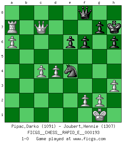 Last move : 1-0 2017 December 31 8:9:14 [Event "FICGS__CHESS__RAPID_E__000193"] [Site "FICGS"] [Date "2017.11.22"] [Round "1"] [White "Pipac,Darko"] [Black "Joubert,Hennie"] [Result "1-0"] [WhiteElo "1091"] [BlackElo "1307"] 1.e4 c5 2.Nf3 e6 3.Nc3 Nc6 4.a3 d6 5.Bb5 Bd7 6.d3 a6 7.Ba4 b5 8.Bb3 Nf6 9.Bg5 Be7 10.O-O O-O 11.h3 h6 12.Bh4 Re8 13.Qe2 Rb8 14.Bg3 a5 15.a4 b4 16.Nb5 Nd4 17.Nbxd4 cxd4 18.e5 dxe5 19.Bxe5 Rb7 20.Bxd4 Bc6 21.Ne5 Bd5 22.Bxd5 Qxd5 23.c3 bxc3 24.bxc3 Reb8 25.Qe3 Rb2 26.c4 Qd6 27.Bxb2 Rxb2 28.Rab1 Rxb1 29.Rxb1 Nh7 30.Rb5 f6 31.Ng6 Nf8 32.Nxe7+ Qxe7 33.Rxa5 Kh7 34.Ra7 Qd6 35.a5 Nd7 36.a6 Nc5 37.Qg3 Qf8 38.d4 Ne4 39.Qc7 1-0 Sicilian defense Kingside Castling by player White (move 10) Kingside Castling by player Black (move 10) Player White won this chess game. Follow this game move after move (download)An attack on the wing should be met by play in the center. (Nimzovitch) Je mehr wir mit Computern analysieren, desto mehr glauben wir an Verteidigung. (Vladimir Kramnik) Un entendimiento minucioso de las típicas continuaciones de mate hacen de las mas complicadas combinaciones de sacrificio que conducen hacia ellas no solo no dificiles, sino casi un asunto de rutina. (Siegbert Tarrasch) Les Echecs sont affaire de jugement sensible. Savoir quand frapper et quand esquiver. (Fischer) Inventor: A person who makes an ingenious arrangement of wheels, levers and springs, and believes it civilization. (Ambrose Bierce, The Devil's Dictionary)