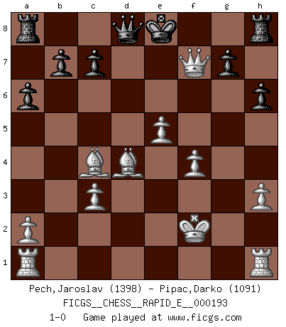 Last move : 1-0 2018 January 28 15:1:28 [Event "FICGS__CHESS__RAPID_E__000193"] [Site "FICGS"] [Date "2017.11.22"] [Round "1"] [White "Pech,Jaroslav"] [Black "Pipac,Darko"] [Result "1-0"] [WhiteElo "1398"] [BlackElo "1091"] 1.d4 d5 2.c4 dxc4 3.Nf3 h6 4.e4 Bg4 5.Nc3 Nc6 6.d5 Ne5 7.Be3 Bxf3 8.gxf3 Nf6 9.f4 Neg4 10.Bd4 a6 11.h3 e5 12.dxe6 Nxf2 13.exf7+ Kxf7 14.Bxc4+ Ke8 15.Kxf2 Bb4 16.e5 Bxc3 17.bxc3 Nh5 18.Qxh5+ Kd7 19.Qf5+ Ke8 20.Qf7+ 1-0 QGA : 3.Nf3 Player White won this chess game. Follow this game move after move (download)With or without the title, Bobby Fischer was unquestionably the greatest player of his time. (Burt Hochberg) Man braucht nicht immer den besten Zug zu spielen: Ein Zug muß aktiv, unternehmungslustig, korrekt und schön sein. (David Bronstein) Fischer no está bajo la obligación de nadie. (Joseph Platz) Toutes les manuvres exécutées sur une colonne ouverte ont pour but ultime l'intrusion définitive sur la septième ou la huitième rangée, en plein cur de la position ennemie. (Aaron Nimzovitch) Shallow men believe in luck. Strong men belive in cause and effect. (Ralph Waldo Emerson)