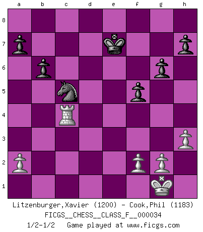 Last move : 1/2-1/2 2007 May 10 10:57:39 [Event "FICGS__CHESS__CLASS_F__000034"] [Site "FICGS"] [Date "2007.04.16"] [Round "1"] [White "Litzenburger,Xavier"] [Black "Cook,Phil"] [Result "1/2-1/2"] [WhiteElo "1200"] [BlackElo "1183"] 1.e4 e5 2.Nf3 Nf6 3.Bc4 Nc6 4.c3 Be7 5.d4 exd4 6.cxd4 d6 7.Nc3 O-O 8.O-O Na5 9.e5 Nxc4 10.exf6 Bxf6 11.b3 Nb6 12.Re1 Bg4 13.h3 Bxf3 14.Qxf3 d5 15.Ba3 Bxd4 16.Bxf8 Qxf8 17.Rac1 Bxc3 18.Rxc3 c6 19.Rce3 Rb8 20.Qe2 g6 21.Re8 Rxe8 22.Qxe8 d4 23.Qxf8+ Kxf8 24.Rd1 c5 25.b4 Nd7 26.bxc5 Nxc5 27.Rxd4 Ke7 28.Rc4 b6 29.Rc3 f5 30.Rc4 1/2-1/2 Petrov : Italian variation Kingside Castling by player Black (move 7) Kingside Castling by player White (move 8) This chess game ended in a draw. Follow this game move after move (download)Weak points or holes in the opponent's position must be occupied by pieces not Pawns. (Siegbert Tarrasch) Schon mancher Spieler hat aufgegeben, um zu vermeiden, daß er eine Figur verliert. (Savielly Grigorievitsch Tartakower) El Ajedrez se juega con la mente... ¡no con las manos!. (Renaud y Kahn) On peut tirer plus d'utilité d'une partie perdue que de 100 parties gagnées. (Capablanca) Don't anthropomorphize computers - they hate it. (Anonymous)