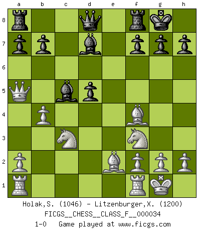Last move : 1-0 2007 May 5 22:14:53 [Event "FICGS__CHESS__CLASS_F__000034"] [Site "FICGS"] [Date "2007.04.16"] [Round "1"] [White "Holak,Stephen"] [Black "Litzenburger,Xavier"] [Result "1-0"] [WhiteElo "1046"] [BlackElo "1200"] 1.d4 d5 2.c4 Nf6 3.cxd5 Nxd5 4.Nf3 Bf5 5.Qb3 e6 6.Nc3 Nc6 7.e4 Na5 8.Qa4+ c6 9.exd5 exd5 10.Bf4 Be7 11.Be2 O-O 12.O-O c5 13.dxc5 Bxc5 14.b4 Bd7 15.Qxa5 1-0 QGD : Marshall defense Kingside Castling by player Black (move 11) Kingside Castling by player White (move 12) Player White won this chess game. Follow this game move after move (download)I won't play with you anymore. You have insulted my friend. - When an opponent cursed himself for a blunder. (Miguel Najdorf) Es tut gut, die Entwicklungsperiode von, [...] demokratischem Geist durchdringen zu lassen. Wie undemokratisch wäre es doch beispielsweise, den einen Offizier große Spaziertouren vornehmen zu lassen, während die anderen zu Hause säßen und sich entsetzlich langweilten. (Aaron Nimzowitsch) El Ajedrez te enseña a controlarl la excitación inicial que sientes cuando vez algo que parece bueno y te enseña a pensar objetivamente cuando te encuentras en problemas. (Stanley Kubrick) Vous m'avez demandé de vous exposer quel est le fondement de la prière. Je ne fais que préparer les pièces du jeu sur la table... Nous sera-t-il permis d'en adopter les règles et si nous les appliquons scrupuleusement nous ne tarderons pas à faire mat le Roi divin ! Il ne pourra échapper à nos mains. (Sainte Thérèse d'Avila, Chemin de perfection) I would love to change the world, but they won't give me the source code. (Unknown)