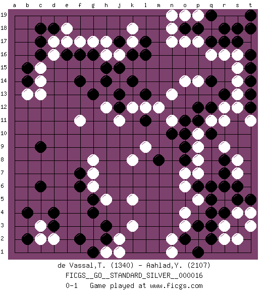 Last move : 0-1 2018 May 4 0:13:14 [Event "FICGS__GO__STANDARD_SILVER__000016"] [Site "FICGS"] [Date "2017.11.27"] [Round "1"] [Black "de Vassal,Thibault"] [White "Aahlad,Yeturu"] [Result "0-1"] [Rating 1 "1340"] [Rating 2 "2107"] 1.d4 d16 2.q4 q16 3.q10 o3 4.p3 o4 5.r6 k3 6.h3 k5 7.c6 r12 8.c17 d17 9.c16 c15 10.b15 c14 11.b14 c13 12.r17 r16 13.q17 p17 14.p18 o17 15.o18 n17 16.q12 q11 17.p11 r11 18.p12 p10 19.o10 p9 20.o9 p8 21.o8 p7 22.k14 n11 23.o11 r3 24.q3 s7 25.s6 r2 26.r4 s4 27.s5 t3 28.q2 s2 29.t5 t4 30.p6 o7 31.r7 s8 32.r8 r9 33.o2 n2 34.p1 n18 35.s17 n13 36.m8 k12 37.h14 h16 38.f14 b13 39.d18 e18 40.c18 h12 41.g13 f11 42.g16 g17 43.f16 f17 44.h15 j16 45.e16 e17 46.l13 m12 47.j12 j11 48.j15 p5 49.q5 o6 50.q6 k8 51.k16 k17 52.j17 h17 53.l17 k18 54.l16 o14 55.c9 h5 56.g4 s16 57.t16 o19 58.q19 t17 59.t15 s15 60.t14 s14 61.t13 s13 62.t12 t11 63.t18 s19 64.s18 r19 65.r18 n19 66.g5 g6 67.f6 g7 68.f7 g8 69.l11 l12 70.n10 l9 71.q14 p14 72.r13 s12 73.j13 c3 74.d3 d2 75.b2 c2 76.b4 j2 77.h2 h1 78.g1 j1 79.f2 n1 80.t19 p19 0-1 Here are the names of the openings (joseki) played in the four corners : Corner q4 : q4 o3 Hoshi (Hwajeom, Seongjeom, Xingwei`) 4-4 Point. The star or hoshi (4-4) point, emphasizing influence at the potential expense of territory. Ikken Kakari (Hankan Keolch'im, Yi Gua`jiao~, 1-Space Low Approach). White 2 is the standard approach move to the 4-4. Corner d16 : d16 c17 Hoshi (Hwajeom, Seongjeom, Xingwei`) 4-4 Point. The star or hoshi (4-4) point, emphasizing influence at the potential expense of territory. Player White won this Go (weiqi, baduk) game. Follow this game move after move (download)Knight's moves win running battles. (Anonymous) Better than a thousand days of diligent study is one day with a great teacher. (Japanese proverb)