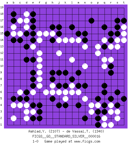 Last move : 1-0 2018 April 26 22:31:46 [Event "FICGS__GO__STANDARD_SILVER__000016"] [Site "FICGS"] [Date "2017.11.27"] [Round "2"] [Black "Aahlad,Yeturu"] [White "de Vassal,Thibault"] [Result "1-0"] [Rating 1 "2107"] [Rating 2 "1340"] 1.q16 d4 2.q3 d16 3.f3 e3 4.f4 c6 5.k4 q5 6.q7 r3 7.q4 r4 8.p5 q2 9.p2 p4 10.p3 o4 11.r5 s5 12.q6 n5 13.s6 s2 14.n7 m6 15.l8 k5 16.j4 j6 17.k7 k6 18.d5 h7 19.c5 c4 20.b5 b4 21.e2 d2 22.e4 d3 23.e7 l7 24.m7 q11 25.h9 l6 26.m4 k8 27.k9 j8 28.j9 f7 29.h8 f8 30.j7 g6 31.h5 h6 32.e8 f9 33.e9 f10 34.d11 f12 35.q13 p12 36.c14 e13 37.e11 f11 38.d13 p13 39.e14 f14 40.e15 f15 41.e16 d17 42.e17 c15 43.h16 j12 44.e18 d18 45.o17 q14 46.l16 h15 47.j15 j14 48.h14 g15 49.j16 k14 50.s4 s3 51.t5 r1 52.p1 q1 53.r14 r13 54.r15 s13 55.b14 b15 56.a15 b16 57.b18 c17 58.f2 b2 59.r10 r11 60.d15 q10 61.b17 n10 62.m9 l11 63.n15 m14 64.n14 n13 65.m15 l14 66.r9 t16 67.s16 t15 68.t17 s14 69.s15 t14 70.s17 o3 71.n2 e6 72.d6 1-0 Here are the names of the openings (joseki) played in the four corners : Corner d4 : d4 f3 Hoshi (Hwajeom, Seongjeom, Xingwei`) 4-4 Point. The star or hoshi (4-4) point, emphasizing influence at the potential expense of territory. Ikken Kakari (Hankan Keolch'im, Yi Gua`jiao~, 1-Space Low Approach). Black 2 is the standard approach move to the 4-4. Corner q4 : q3 q5 Komoku (Somok, Xiao~mu`) 3-4 Point. The komoku (3-4) point is the traditional corner enclosure move.. Ikken Takagakari (Hankan Nop'dakeolch'im, Yi Gaogua`jiao~, 1-Space High Approach). The 5-4 approach move has become more popular in modern times, as modern Go emphasizes speed and influence. Corner q16 : q16 q11 Hoshi (Hwajeom, Seongjeom, Xingwei`) 4-4 Point. The star or hoshi (4-4) point, emphasizing influence at the potential expense of territory. Corner d16 : d16 d11 Hoshi (Hwajeom, Seongjeom, Xingwei`) 4-4 Point. The star or hoshi (4-4) point, emphasizing influence at the potential expense of territory. Player Black won this Go (weiqi, baduk) game. Follow this game move after move (download)If a formation is symmetrical, play at the center. (Anonymous) Creativity is inventing, experimenting, growing, taking risks, breaking rules, making mistakes, and having fun. (Mary Lou Cook)