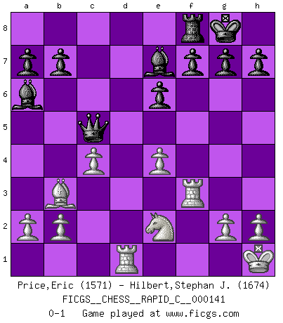 Last move : 0-1 2018 February 10 13:41:56 [Event "FICGS__CHESS__RAPID_C__000141"] [Site "FICGS"] [Date "2017.11.28"] [Round "1"] [White "Price,Eric"] [Black "Hilbert,Stephan J."] [Result "0-1"] [WhiteElo "1571"] [BlackElo "1674"] 1.e4 d5 2.exd5 Qxd5 3.Nc3 Qa5 4.d4 Nf6 5.Bc4 Bg4 6.f3 Bd7 7.Nge2 e6 8.O-O Be7 9.Ne4 Bb5 10.Bb3 O-O 11.c4 Ba6 12.Bd2 Qb6 13.Be3 Nxe4 14.fxe4 Nc6 15.Rf3 Rad8 16.Kh1 Nxd4 17.Bxd4 c5 18.Bxc5 Rxd1+ 19.Rxd1 Qxc5 0-1 Scandinavian (centre counter) defense Kingside Castling by player White (move 8) Kingside Castling by player Black (move 10) Player Black won this chess game. Follow this game move after move (download)I have added these principles to the law: get the Knights into action before both Bishops are developed. (Emanuel Lasker) Computer sind die einzigen Gegner, die nicht immer eine Ausrede auf Lager haben, wenn sie gegen mich verlieren. (Robert James Fischer) No todos los artistas son jugadores de Ajedrez, pero todos los jugadores de Ajedrez son artistas. (Marcel Duchamp) Echiquier : carré parfait, comme la Jérusalem nouvelle décrite par l'auteur de l'Apocalypse, huit cases sur huit, exaltation du chiffre 4, symbole du cosmos aux quatre horizons... où le noir et le blanc, l'ombre et la lumière, le mal et le bien s'entremêlent et se conjuguent. (Robert Couffignal, Le Gambit du poète) The modern world has divided itself into Conservatives and Progressives. The business of Progressives is to go on making mistakes. The business of the Conservatives is to prevent the mistakes from being corrected. (G.K. Chesterton)
