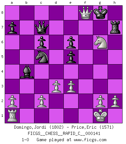 Last move : 1-0 2018 January 15 23:49:32 [Event "FICGS__CHESS__RAPID_C__000141"] [Site "FICGS"] [Date "2017.11.28"] [Round "1"] [White "Domingo,Jordi"] [Black "Price,Eric"] [Result "1-0"] [WhiteElo "1802"] [BlackElo "1571"] 1.e4 e5 2.Nf3 Nc6 3.Bc4 Nf6 4.Ng5 d5 5.exd5 Na5 6.d3 h6 7.Nf3 Bd6 8.Bb5+ c6 9.dxc6 bxc6 10.Ba4 O-O 11.O-O Qc7 12.Nc3 Nb7 13.Be3 Rd8 14.Qe2 Nd5 15.Bb3 Nxe3 16.fxe3 Nc5 17.Bc4 Be6 18.b4 Nd7 19.Bxe6 fxe6 20.Ne4 Bxb4 21.Nh4 Nc5 22.Nf6+ gxf6 23.Rxf6 Kh7 24.Qh5 Rd7 25.Qxh6+ Kg8 26.Ng6 Rh7 27.Rf8+ Rxf8 28.Qxf8+ 1-0 Two knights defense : Kieseritsky variation Kingside Castling by player Black (move 10) Kingside Castling by player White (move 11) Player White won this chess game. Follow this game move after move (download)A good sacrifice is one that is not necessarily sound but leaves your opponent dazed and confused. (Rudolph Spielmann) Bis jetzt ist Weiß einer wohlbekannten Analyse gefolgt. Aber jetzt begeht er einen schrecklichen Fehler: Er beginnt seinen eigenen Kopf zu benutzen. (Siegbert Tarrasch) Un mal día en el Ajedrez, es mejor que cualquier buen día en el trabajo. (Anonymous) L'attaque fait le spectacle, la défense gagne les matchs. (Dicton footballistique) History is a gallery of pictures in which there are few originals and many copies. (Alexis de Tocqueville)