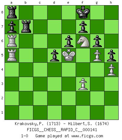 Last move : 1-0 2018 April 30 10:3:47 [Event "FICGS__CHESS__RAPID_C__000141"] [Site "FICGS"] [Date "2017.11.28"] [Round "1"] [White "Krakovsky,Peter"] [Black "Hilbert,Stephan J."] [Result "1-0"] [WhiteElo "1713"] [BlackElo "1674"] 1.d4 b5 2.e4 Bb7 3.Bd3 Nf6 4.Qe2 c5 5.dxc5 Na6 6.c6 Bxc6 7.a4 Nc5 8.axb5 Bxe4 9.Bxe4 Ncxe4 10.Be3 d5 11.Nf3 e6 12.O-O Bc5 13.Nc3 O-O 14.Nxe4 Nxe4 15.Bxc5 Nxc5 16.Ra3 Qb6 17.Ne5 Rfb8 18.b4 Ne4 19.c4 Qb7 20.c5 Qxb5 21.Qxb5 Rxb5 22.f3 Nxc5 23.bxc5 Rxc5 24.Nd3 Rc7 25.Rfa1 g6 26.h4 Rc4 27.g3 Rc7 28.g4 Kg7 29.Kf2 Re7 30.g5 h6 31.Ke3 Rb7 32.Ra6 Rc7 33.Ne5 Rb7 34.R1a4 Re7 35.Ng4 h5 36.Nf6 Rc7 37.Kd4 Rb7 38.R4a5 Kf8 39.Ke5 1-0 This chess game has been lost on time (started : 2017.11.28 11:57:34) Polish defense Kingside Castling by player White (move 12) Kingside Castling by player Black (move 13) Player White won this chess game. Follow this game move after move (download)A bad plan is better than none at all. (Frank Marshall) Dein Körper muss in Topform sein. Dein Schach verfällt, wenn dein Körper verfällt. Der Körper kann nicht vom Geist getrennt werden. (Robert James Fischer) La partida mas dura de ganar es una partida ganada. (Emanuel Lasker) Les Echecs sont et restent toujours un combat, un combat intégral comme la boxe, la lutte ou un autre sport, et où il doit y avoir un vainqueur et un vaincu. (Joseph Emil Diemer) To steal ideas from one person is plagiarism. To steal from many is research. (Unknown)
