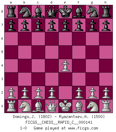 Last move : 1-0 2018 February 2 12:32:28 [Event "FICGS__CHESS__RAPID_C__000141"] [Site "FICGS"] [Date "2018.01.01"] [Round "1"] [White "Domingo,Jordi"] [Black "Ryazantsev,Alexander"] [Result "1-0"] [WhiteElo "1802"] [BlackElo "1500"] 1.e4 1-0 This chess game has been lost on time (started : 2018.01.01 22:25:37) King's pawn Opening Player White won this chess game. Follow this game move after move (download)A thorough understanding of the typical mating continuations makes the most complicated sacrificial combinations leading up to them not only not difficult, but almost a matter of course. (Siegbert Tarrasch) Karpov ist ein Museumsstück. (Garry Kasparov) Cuando me preguntan: -¿Cual es el secreto que te hace hacer mejores movidas que tus oponentes?, Yo respondo: Me da gusto que me pregunten eso, porque, como veran, hay una simple razón. Yo pienso mis propias movidas y dejo a mi oponente que el piense las suyas. (Alexander Alekhine) Les Echecs, c'est l'art de la guerre sans les charniers, c'est la résurrection des morts tombés au champ d'honneur, l'espoir perpétuel, la suprématie de l'intelligence sur la force, la culture de l'esprit. (F. Szpiner) You can't play chess if you're groggy from pills. (Anatoly Karpov)