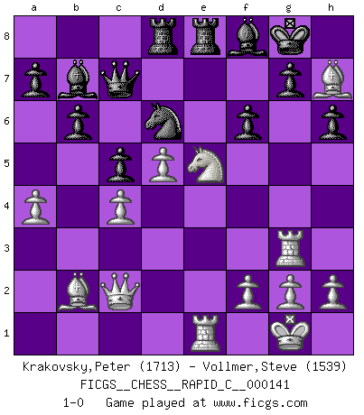Last move : 1-0 2017 December 17 12:21:10 [Event "FICGS__CHESS__RAPID_C__000141"] [Site "FICGS"] [Date "2017.11.28"] [Round "1"] [White "Krakovsky,Peter"] [Black "Vollmer,Steve"] [Result "1-0"] [WhiteElo "1713"] [BlackElo "1539"] 1.d4 d5 2.c4 e6 3.Nf3 Nf6 4.Nc3 c5 5.cxd5 Nxd5 6.e4 Nxc3 7.bxc3 Be7 8.Bd3 b6 9.d5 exd5 10.exd5 Bb7 11.c4 O-O 12.O-O Na6 13.a3 Nc7 14.Re1 Ne8 15.Bb2 Nd6 16.Qc2 h6 17.a4 Qc7 18.Re3 Rfe8 19.Rae1 Bf8 20.Ne5 Rad8 21.Rg3 f6 22.Bh7+ 1-0 Queen's gambit declined Kingside Castling by player Black (move 11) Kingside Castling by player White (move 12) Player White won this chess game. Follow this game move after move (download)If you aren't afraid of Spassky, then I have removed the element of money. (Jim Slater) Schach verlangt totale Konzentration. (Robert James Fischer) En un gambito tu regalas un Peón por el bién de tomar un juego perdido. (Samuel Standige Boden) Je menace de comprendre la position. (Anonyme) Perhaps chess is the wrong game for the times (The Chess Master and the Computer, by Garry Kasparov - 2010)