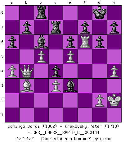 Last move : 1/2-1/2 2018 January 27 12:37:20 [Event "FICGS__CHESS__RAPID_C__000141"] [Site "FICGS"] [Date "2017.11.28"] [Round "1"] [White "Domingo,Jordi"] [Black "Krakovsky,Peter"] [Result "1/2-1/2"] [WhiteElo "1802"] [BlackElo "1713"] 1.e4 c5 2.Nf3 d6 3.c3 Nf6 4.Be2 g6 5.O-O Bg7 6.Bb5+ Nc6 7.Re1 O-O 8.h3 Bd7 9.Ba4 Ne5 10.Bc2 Nxf3+ 11.Qxf3 Bc6 12.d3 d5 13.Nd2 d4 14.cxd4 cxd4 15.Nc4 Nd7 16.b4 Ne5 17.Nxe5 Bxe5 18.a4 Bd7 19.Bb3 e6 20.Bh6 Re8 21.Rec1 Qe7 22.Rc5 Qd6 23.Qe2 Rec8 24.f4 Bxf4 25.e5 Qxc5 26.bxc5 Bxh6 27.Rf1 Rc7 28.Kh2 Be3 29.Qe1 Rac8 30.Qa5 a6 31.Qb4 Bc6 32.h4 Rd7 33.Rf6 1/2-1/2 Sicilian Kingside Castling by player White (move 5) Kingside Castling by player Black (move 7) This chess game ended in a draw. Follow this game move after move (download)A win by an unsound combination, however showy, fills me with artistic horror. (Wilhelm Steinitz) Es ist schade, dass viele Schachsportler vergessen, wie wichtig Auftreten und angemessene Kleidung sind. (Alexandra Kosteniuk) Tu eres para mi la Reina en d8 y yo soy el Peón en d7!!. (GM Eduard Gufeld) Le joueur d'Echecs qui veut atteindre le top est obligé de développer son propre credo créatif. Alexeï Stepanovicth Souétine. Il est facile d'écrire des livres ! Ce qui est difficile, c'est de jouer ! (Alexeï Stepanovicth Souétine) The meaning of life is that it is to be lived, and it is not to be traded and conceptualized and squeezed into a pattern of systems. (Bruce Lee)