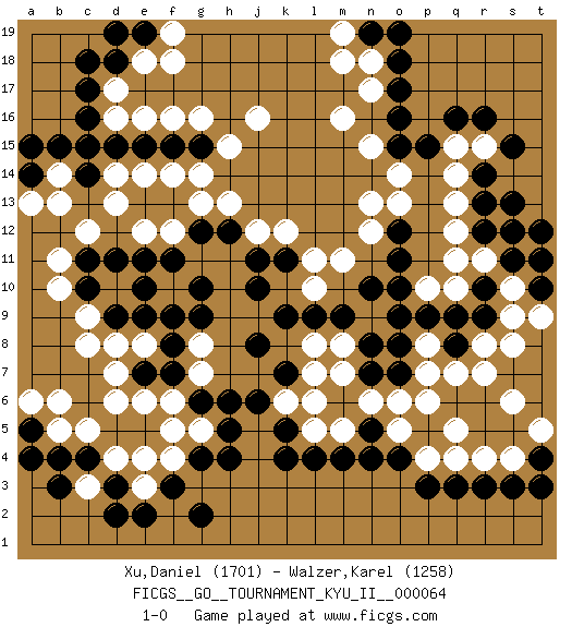Last move : 1-0 2018 April 2 18:41:21 [Event "FICGS__GO__TOURNAMENT_KYU_II__000064"] [Site "FICGS"] [Date "2017.11.29"] [Round "1"] [Black "Xu,Daniel"] [White "Walzer,Karel"] [Result "1-0"] [Rating 1 "1701"] [Rating 2 "1258"] 1.q16 d4 2.q3 d16 3.r9 q5 4.o4 r4 5.r3 r8 6.q8 r7 7.q9 p6 8.n8 n6 9.m4 m5 10.l4 l5 11.k4 q14 12.o16 r15 13.r16 r11 14.r12 q12 15.r13 q13 16.s11 s10 17.r10 q11 18.s13 t11 19.s12 s9 20.s15 n12 21.n10 m11 22.l9 m16 23.f3 f4 24.g4 f5 25.d3 e3 26.e2 e4 27.g2 c3 28.d2 d8 29.j6 n17 30.o17 j16 31.c14 c12 32.c16 d17 33.c17 d14 34.d15 f16 35.e15 g13 36.f15 g16 37.d9 c9 38.c10 d10 39.e9 c8 40.d11 b10 41.e10 b11 42.c4 c5 43.b4 b5 44.b3 g8 45.g10 d13 46.j10 j12 47.j8 l7 48.k7 l8 49.k9 n15 50.d18 e18 51.c18 e16 52.s3 s4 53.o18 n18 54.e19 f19 55.d19 f18 56.n19 m19 57.o19 m18 58.f7 g5 59.h4 g7 60.e7 e8 61.f8 d6 62.g9 l10 63.m9 p4 64.p3 o5 65.n4 q4 66.t4 t5 67.t3 s6 68.h12 h13 69.j11 k12 70.g12 f12 71.f11 e12 72.o12 o13 73.o11 n13 74.g15 h15 75.g6 e6 76.h5 f6 77.h6 d7 78.f9 b14 79.b15 b13 80.a5 a6 81.a4 b6 82.o15 o14 83.r14 q15 84.k11 l11 85.a14 a13 86.a15 q7 87.t12 s8 88.o7 p8 89.p9 p7 90.o8 p10 91.o10 q10 92.o9 m8 93.n7 m7 94.n5 o6 95.e11 g14 96.t10 t9 97.t11 k6 98.k5 l6 99.p15 e14 100.c11 f14 101.c15 1-0 Here are the names of the openings (joseki) played in the four corners : Corner q16 : q16 q14 Hoshi (Hwajeom, Seongjeom, Xingwei`) 4-4 Point. The star or hoshi (4-4) point, emphasizing influence at the potential expense of territory. Ikken Takagakari (Hankan Nop'dakeolch'im, Yi Gaojia, 1-Space High Approach). Black typically responds at 6-4 or 3-10. Black 4-10 is played when Black finds play on the right side advantageous. Black 4-8 or 3-8 may be played when Black has support at top. Corner d4 : d4 f3 Hoshi (Hwajeom, Seongjeom, Xingwei`) 4-4 Point. The star or hoshi (4-4) point, emphasizing influence at the potential expense of territory. Ikken Kakari (Hankan Keolch'im, Yi Gua`jiao~, 1-Space Low Approach). Black 2 is the standard approach move to the 4-4. Player Black won this Go (weiqi, baduk) game. Follow this game move after move (download)For rectangular six in the corner, dame is necessary. (Anonymous) Art disturbs, science reassures. (Georges Braque, Le Jour et la Nuit)