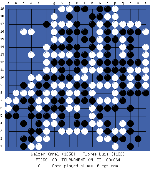 Last move : 0-1 2018 February 1 11:41:16 [Event "FICGS__GO__TOURNAMENT_KYU_II__000064"] [Site "FICGS"] [Date "2017.11.29"] [Round "1"] [Black "Walzer,Karel"] [White "Flores,Luis"] [Result "0-1"] [Rating 1 "1258"] [Rating 2 "1132"] 1.d3 q4 2.q16 d16 3.d5 d10 4.k4 m4 5.q10 k10 6.k16 d13 7.f17 j13 8.r6 g9 9.c9 g15 10.p6 l17 11.k17 n17 12.o17 n16 13.r13 p17 14.o16 p16 15.o15 o18 16.p15 q17 17.r16 r17 18.n12 q15 19.r15 q14 20.r14 g17 21.l16 n15 22.o14 n14 23.o13 k3 24.l4 l3 25.r3 g18 26.l13 h3 27.o3 q3 28.r4 n3 29.o4 o2 30.p2 n2 31.q2 l14 32.k14 m13 33.k13 m12 34.k11 l11 35.j12 j11 36.j14 h13 37.h14 g13 38.h16 g16 39.l15 r2 40.m17 l18 41.m18 q13 42.q12 s17 43.n18 p18 44.m14 n13 45.l12 o12 46.p12 m11 47.k12 l10 48.h8 h9 49.j10 j9 50.h11 m5 51.m7 d8 52.b6 c6 53.b5 c5 54.c4 n7 55.n5 b7 56.c7 c8 57.d7 m6 58.k7 j8 59.k9 k8 60.l9 m9 61.l8 m8 62.l7 k18 63.j18 j19 64.k19 j6 65.e8 d9 66.g7 j7 67.h4 g4 68.h5 e7 69.d6 g5 70.f6 f3 71.h6 f8 72.g6 p8 73.q8 p9 74.q9 p7 75.q7 c16 76.o11 b8 77.n6 o7 78.o6 e2 79.d2 d1 80.c1 e1 81.c2 h19 82.l19 g11 83.g14 f14 84.g12 f12 85.h12 f13 86.g10 f11 87.h10 t14 88.s12 t12 89.s16 t16 90.t11 t13 91.f10 s11 92.s9 r11 93.r12 t9 94.t8 t10 95.s8 j3 96.k5 k6 97.e9 e10 98.f9 g8 99.h7 f7 100.f5 f4 101.e3 f2 102.o10 o9 103.n10 n9 104.o19 p19 105.n19 h15 106.j15 h17 107.j16 j17 108.m15 p3 109.s2 p1 110.r1 a6 111.a5 a7 112.e4 e6 113.e5 r10 114.s10 t11 115.q11 r9 116.r8 p10 117.p11 n11 118.o12 n4 0-1 Here are the names of the openings (joseki) played in the four corners : Corner q16 : q16 l17 Hoshi (Hwajeom, Seongjeom, Xingwei`) 4-4 Point. The star or hoshi (4-4) point, emphasizing influence at the potential expense of territory. Player White won this Go (weiqi, baduk) game. Follow this game move after move (download)A meijin needs no joseki. (Anonymous) I've lost money so fast in these clubs it's left me reeling. I've read every poker book ever written, but the only way to get better at the game is to go out and play with people who are really good. The problem is, you stand to lose a lot of money doing it. (Matt Damon)