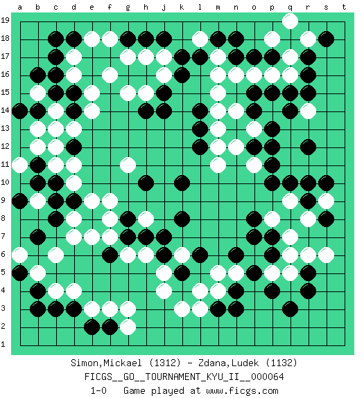 Last move : 1-0 2018 May 18 22:53:53 [Event "FICGS__GO__TOURNAMENT_KYU_II__000064"] [Site "FICGS"] [Date "2017.11.29"] [Round "1"] [Black "Simon,Mickael"] [White "Zdana,Ludek"] [Result "1-0"] [Rating 1 "1312"] [Rating 2 "1132"] 1.r16 d4 2.q3 d17 3.p17 q5 4.r5 r6 5.r4 q7 6.c3 c4 7.d3 e3 8.e2 f3 9.f2 g3 10.b4 b5 11.b3 c6 12.d15 f16 13.c17 d16 14.c16 e15 15.d14 d10 16.r10 k3 17.p10 r14 18.r12 p14 19.k16 j17 20.k17 j16 21.j15 h15 22.j14 m15 23.h14 g15 24.j18 h17 25.l14 o16 26.o17 n16 27.n17 p16 28.m3 k6 29.c8 f9 30.b10 c12 31.d12 c11 32.c10 d11 33.d9 e9 34.e8 d7 35.b7 b9 36.b11 b12 37.a5 a6 38.c9 d8 39.a9 a11 40.p6 q6 41.p4 p5 42.o5 o6 43.p7 p8 44.o7 m4 45.n4 n5 46.n6 m5 47.n3 l3 48.h18 g17 49.g18 f18 50.d18 e18 51.c18 b15 52.b14 b13 53.a14 c14 54.c15 c13 55.b16 d13 56.o8 s6 57.s8 q9 58.q10 s9 59.r9 r8 60.s10 e14 61.q15 q16 62.r15 q17 63.s18 r18 64.q14 m17 65.m18 l18 66.l17 m16 67.n18 p18 68.r17 q19 69.k8 h8 70.j7 h6 71.h7 g6 72.g7 f7 73.j6 j5 74.f6 e7 75.g8 f8 76.k5 j4 77.l6 l4 78.h10 g11 79.p13 m14 80.l13 m13 81.o14 o13 82.p15 m11 83.l12 m12 84.k10 g2 85.o12 n14 86.o15 o11 87.p11 n12 88.p12 1-0 Here are the names of the openings (joseki) played in the four corners : Corner q4 : q3 q5 Komoku (Somok, Xiao~mu`) 3-4 Point. The komoku (3-4) point is the traditional corner enclosure move.. Ikken Takagakari (Hankan Nop'dakeolch'im, Yi Gaogua`jiao~, 1-Space High Approach). The 5-4 approach move has become more popular in modern times, as modern Go emphasizes speed and influence. Corner d4 : d4 c3 Hoshi (Hwajeom, Seongjeom, Xingwei`) 4-4 Point. The star or hoshi (4-4) point, emphasizing influence at the potential expense of territory. Corner d16 : d17 d15 Komoku (Somok, Xiao~mu`) 3-4 Point. The komoku (3-4) point is the traditional corner enclosure move.. Ikken Takagakari (Hankan Nop'dakeolch'im, Yi Gaogua`jiao~, 1-Space High Approach). The 5-4 approach move has become more popular in modern times, as modern Go emphasizes speed and influence. Player Black won this Go (weiqi, baduk) game. Follow this game move after move (download)Don't try to enclose an open skirt. (Anonymous) Cactus - It is depressed cucumber. (Ilmars Cirulis)
