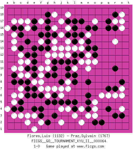 Last move : 1-0 2018 May 20 14:38:9 [Event "FICGS__GO__TOURNAMENT_KYU_II__000064"] [Site "FICGS"] [Date "2017.11.29"] [Round "1"] [Black "Flores,Luis"] [White "Praz,Sylvain"] [Result "1-0"] [Rating 1 "1132"] [Rating 2 "1767"] 1.q4 d16 2.q16 d3 3.r10 c9 4.n8 k4 5.r3 f17 6.k13 o17 7.c8 d9 8.d8 e8 9.e7 f7 10.e9 f8 11.b9 b10 12.b8 c11 13.e6 c6 14.f6 g6 15.g5 h7 16.h6 g7 17.f4 j6 18.c4 c3 19.c5 b3 20.h5 k7 21.e2 e3 22.f3 d2 23.e10 d11 24.j8 j7 25.l9 b6 26.e4 b5 27.b4 a4 28.d6 f2 29.g2 e1 30.h3 k16 31.h10 o3 32.n4 o4 33.n5 o5 34.n6 n3 35.m3 l3 36.l4 m2 37.k5 m4 38.l5 j4 39.j5 g10 40.p2 p6 41.g9 f9 42.e11 f10 43.e12 g12 44.c13 d13 45.d12 c12 46.d10 c10 47.e13 b13 48.d14 b14 49.c15 b15 50.c16 c17 51.b16 b17 52.e16 d17 53.g14 j10 54.h11 h12 55.j11 g11 56.j14 f14 57.f13 j12 58.k11 k12 59.l12 l13 60.l14 m13 61.l11 h14 62.h15 g15 63.g13 h13 64.g16 j15 65.f15 m14 66.l15 m16 67.l16 h16 68.m15 g15 69.e17 n15 70.n16 k14 71.k15 j13 72.o16 r14 73.m17 k14 74.g17 a16 75.k17 r17 76.r16 s16 77.q17 s18 78.r18 s17 79.h15 r6 80.o13 n12 81.o12 n10 82.n11 m11 83.m12 o11 84.n13 n11 85.n14 k13 86.l8 j17 87.j16 c7 88.d7 k16 89.q7 q6 90.r7 s4 91.s3 s7 92.s8 s6 93.o2 j2 94.j16 j9 95.h9 k16 96.g15 k18 97.j16 l10 98.k10 k16 99.l17 h18 100.j16 k8 101.k9 k16 102.g18 1-0 Here are the names of the openings (joseki) played in the four corners : Corner q16 : q16 o17 Hoshi (Hwajeom, Seongjeom, Xingwei`) 4-4 Point. The star or hoshi (4-4) point, emphasizing influence at the potential expense of territory. Ikken Kakari (Hankan Keolch'im, Yi Gua`jiao~, 1-Space Low Approach). White 2 is the standard approach move to the 4-4. Player Black won this Go (weiqi, baduk) game. Follow this game move after move (download)Every move brings change. (Pierre Audouard) Whoever said the pen is mightier than the sword obviously never encountered automatic weapons. (US General Douglas MacArthur)