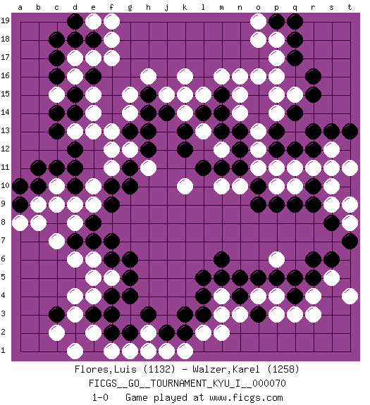 Last move : 1-0 2018 January 28 19:15:57 [Event "FICGS__GO__TOURNAMENT_KYU_I__000070"] [Site "FICGS"] [Date "2017.11.29"] [Round "1"] [Black "Flores,Luis"] [White "Walzer,Karel"] [Result "1-0"] [Rating 1 "1132"] [Rating 2 "1258"] 1.q17 d3 2.q4 d16 3.r10 q15 4.r16 p16 5.c11 c9 6.g6 d6 7.k3 o4 8.m6 p6 9.o5 p4 10.p5 q3 11.q5 r3 12.n5 s5 13.r6 p17 14.q18 p18 15.k12 k16 16.c17 d17 17.c16 c15 18.d15 e15 19.d14 e14 20.d18 f17 21.e16 e17 22.c14 g3 23.g13 g14 24.h13 e13 25.r13 m3 26.n4 n3 27.p13 n15 28.o3 p3 29.l4 l2 30.r15 m12 31.f7 e9 32.n13 l13 33.m14 k14 34.k15 l15 35.m15 m16 36.l14 j15 37.k13 n14 38.m13 o13 39.n12 o12 40.n11 o11 41.o14 p14 42.o15 n16 43.o10 n10 44.m11 p10 45.o9 q11 46.p9 q10 47.p12 p11 48.q9 r11 49.s11 s10 50.r9 s12 51.r12 t11 52.s13 s9 53.q12 s11 54.s8 m10 55.l11 k10 56.f10 h11 57.f9 f12 58.g11 g12 59.h12 f11 60.g10 e10 61.e3 e4 62.f4 d4 63.f3 h1 64.d2 c2 65.c3 e2 66.f2 d1 67.p19 o19 68.q19 o18 69.e18 f18 70.q14 p15 71.g2 h2 72.k2 k1 73.h3 j1 74.l3 m2 75.b10 b9 76.d12 m4 77.l5 f5 78.g5 e6 79.e8 d8 80.a9 a8 81.a10 b8 82.s6 r4 83.r5 t4 84.h14 g15 85.h15 h16 86.j14 k15 87.j2 f1 88.f6 e5 89.e7 g1 90.g4 t8 91.t7 t9 92.d7 c7 93.d10 c10 94.b11 d13 95.c13 e19 96.c18 f13 97.d19 f19 98.d11 d9 99.m5 o16 100.t13 1-0 Here are the names of the openings (joseki) played in the four corners : Corner q16 : q17 q15 Komoku (Somok, Xiao~mu`) 3-4 Point. The komoku (3-4) point is the traditional corner enclosure move.. Ikken Takagakari (Hankan Nop'dakeolch'im, Yi Gaogua`jiao~, 1-Space High Approach). The 5-4 approach move has become more popular in modern times, as modern Go emphasizes speed and influence. Corner d16 : d16 c11 Hoshi (Hwajeom, Seongjeom, Xingwei`) 4-4 Point. The star or hoshi (4-4) point, emphasizing influence at the potential expense of territory. Corner q4 : q4 o4 Hoshi (Hwajeom, Seongjeom, Xingwei`) 4-4 Point. The star or hoshi (4-4) point, emphasizing influence at the potential expense of territory. Ikken Takagakari (Hankan Nop'dakeolch'im, Yi Gaojia, 1-Space High Approach). Black typically responds at 6-4 or 3-10. Black 4-10 is played when Black finds play on the right side advantageous. Black 4-8 or 3-8 may be played when Black has support at top. Player Black won this Go (weiqi, baduk) game. Follow this game move after move (download)If there is no stone on the handicap point, the carpenter's square is dead. (Anonymous) The large trees attract high winds. (Chinese proverb)