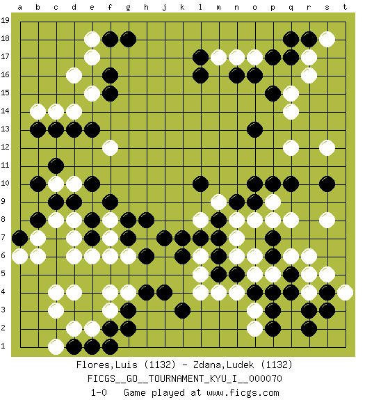 Last move : 1-0 2018 February 24 15:6:9 [Event "FICGS__GO__TOURNAMENT_KYU_I__000070"] [Site "FICGS"] [Date "2017.11.29"] [Round "1"] [Black "Flores,Luis"] [White "Zdana,Ludek"] [Result "1-0"] [Rating 1 "1132"] [Rating 2 "1132"] 1.q17 d4 2.q4 d16 3.q10 c10 4.o13 o17 5.l10 o3 6.g18 e18 7.l17 q15 8.j7 l4 9.e13 d14 10.e10 g4 11.j4 r6 12.c11 d8 13.o16 q12 14.s4 q8 15.o10 p5 16.s10 s12 17.q5 q6 18.p4 o5 19.o4 n4 20.n5 n6 21.m5 m4 22.m6 n7 23.m7 n8 24.p17 r16 25.p6 o6 26.p7 p9 27.o9 o8 28.p10 l8 29.m8 m9 30.n9 p8 31.k6 s8 32.p2 s5 33.k3 l6 34.l7 l5 35.k7 r4 36.r3 r5 37.s3 r17 38.c9 c8 39.b10 f12 40.d13 c14 41.f15 e15 42.f16 d10 43.d9 c4 44.e8 d6 45.g2 f3 46.f2 e2 47.g3 f4 48.p15 q14 49.e7 d7 50.b8 b7 51.a7 b6 52.e1 d2 53.h4 g6 54.g7 e6 55.d1 c1 56.f1 c3 57.r18 s18 58.q18 n17 59.n16 m17 60.l16 a6 61.b13 b14 62.f18 e17 63.c13 h7 64.h8 f7 65.g8 f8 66.f9 f6 67.h6 o2 68.p3 t4 69.r2 1-0 Here are the names of the openings (joseki) played in the four corners : Corner q4 : q4 o3 Hoshi (Hwajeom, Seongjeom, Xingwei`) 4-4 Point. The star or hoshi (4-4) point, emphasizing influence at the potential expense of territory. Ikken Kakari (Hankan Keolch'im, Yi Gua`jiao~, 1-Space Low Approach). White 2 is the standard approach move to the 4-4. Corner d16 : d16 g18 Hoshi (Hwajeom, Seongjeom, Xingwei`) 4-4 Point. The star or hoshi (4-4) point, emphasizing influence at the potential expense of territory. Corner d4 : d4 j7 Hoshi (Hwajeom, Seongjeom, Xingwei`) 4-4 Point. The star or hoshi (4-4) point, emphasizing influence at the potential expense of territory. Player Black won this Go (weiqi, baduk) game. Follow this game move after move (download)Keep away from thickness. (Anonymous) Two beer, or not two beer. (Unknown)