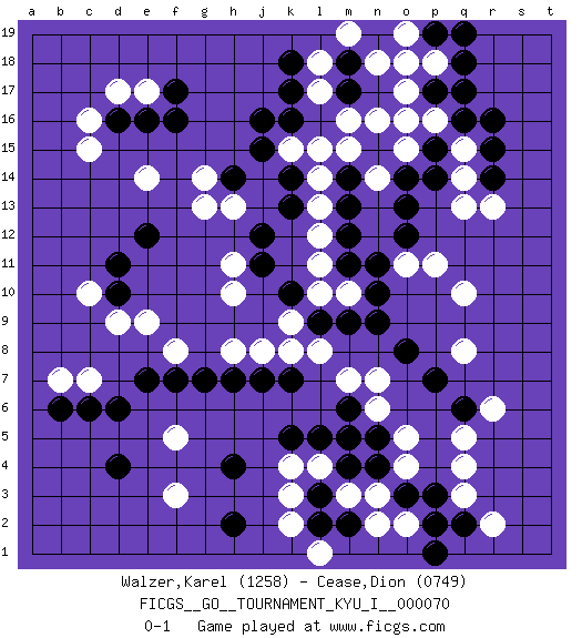Last move : 0-1 2018 April 10 0:26:7 [Event "FICGS__GO__TOURNAMENT_KYU_I__000070 "] [Site "FICGS"] [Date "2017.11.29"] [Round "1"] [Black "Walzer,Karel "] [White "Cease,Dion "] [Result "0-1"] [Rating 1 "1258"] [Rating 2 "0749"] 1.d4 c16 2.q16 q4 3.e16 e17 4.d16 d17 5.f16 c15 6.f17 o17 7.m17 q13 8.p17 o16 9.r14 q14 10.r15 m15 11.k16 r13 12.q6 q8 13.o3 o4 14.n4 o5 15.p3 q5 16.d10 q3 17.p7 n7 18.o8 r6 19.n9 q15 20.r16 p18 21.q18 p16 22.q17 k4 23.l3 l8 24.m11 k3 25.l2 k15 26.j16 q10 27.k10 f3 28.h4 f5 29.d6 k2 30.q2 r2 31.p1 l4 32.m4 n2 33.m2 o2 34.p2 n3 35.m6 m5 36.n5 n6 37.l5 m3 38.m5 l1 39.k7 m7 40.k5 k8 41.j7 j8 42.h7 h8 43.g7 h10 44.k13 l12 45.j11 h11 46.j12 e9 47.e7 d9 48.e12 c10 49.d11 f8 50.f7 c7 51.c6 g13 52.h14 h13 53.k14 e14 54.h2 g14 55.j15 b7 56.b6 m10 57.n10 l11 58.m9 l10 59.l9 k9 60.m12 l13 61.m14 l14 62.m13 l15 63.n15 n16 64.o14 m16 65.o12 p11 66.p15 l17 67.k17 l18 68.k18 n18 69.p19 o15 70.p14 n14 71.o13 o19 72.o18 o11 73.n11 p18 74.q19 o18 75.m18 m19 0-1 Here are the names of the openings (joseki) played in the four corners : Corner d16 : c16 e16Komoku (Somok, Xiao~mu`) 3-4 Point. The komoku (3-4) point is the traditional corner enclosure move..Ikken Takagakari (Hankan Nop'dakeolch'im, Yi Gaogua`jiao~, 1-Space High Approach). The 5-4 approach move has become more popular in modern times, as modern Go emphasizes speed and influence. Corner q16 : q16 o17Hoshi (Hwajeom, Seongjeom, Xingwei`) 4-4 Point. The star or hoshi (4-4) point, emphasizing influence at the potential expense of territory.Ikken Kakari (Hankan Keolch'im, Yi Gua`jiao~, 1-Space Low Approach). White 2 is the standard approach move to the 4-4. Corner q4 : q4 q6Hoshi (Hwajeom, Seongjeom, Xingwei`) 4-4 Point. The star or hoshi (4-4) point, emphasizing influence at the potential expense of territory.Ikken Takagakari (Hankan Nop'dakeolch'im, Yi Gaojia, 1-Space High Approach). White typically responds at 6-4 or 3-10. White 4-10 is played when White finds play on the right side advantageous. White 4-8 or 3-8 may be played when White has support at top. Corner d4 : d4 f3Hoshi (Hwajeom, Seongjeom, Xingwei`) 4-4 Point. The star or hoshi (4-4) point, emphasizing influence at the potential expense of territory.Ikken Kakari (Hankan Keolch'im, Yi Gua`jiao~, 1-Space Low Approach). White 2 is the standard approach move to the 4-4. Player White won this Go (weiqi, baduk) game.Follow this game move after move (download ) Very few good moves are played. (Pierre Audouard) May I never be complete. May I never be content. May I never be perfect. Deliver me, Tyler, from being perfect and complete. (Chuck Palahniuk, Fight Club)
