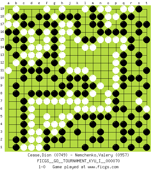 Last move : 1-0 2018 July 14 7:46:14 [Event "FICGS__GO__TOURNAMENT_KYU_I__000070"] [Site "FICGS"] [Date "2017.11.29"] [Round "1"] [Black "Cease,Dion"] [White "Nemchenko,Valery"] [Result "1-0"] [Rating 1 "0749"] [Rating 2 "0957"] 1.q3 d16 2.q17 d4 3.r5 o4 4.r15 p15 5.o16 q14 6.r14 p13 7.q12 p12 8.q11 p11 9.q10 p10 10.q9 p9 11.p8 o8 12.p7 o7 13.f3 f5 14.h3 h4 15.j4 h5 16.k3 j5 17.k5 k6 18.l5 l6 19.c11 d9 20.c14 e14 21.e11 f10 22.f11 g11 23.g12 h12 24.g13 h13 25.g14 h14 26.g15 h15 27.g16 h16 28.e10 e9 29.g10 f9 30.h11 j11 31.j10 k11 32.c17 e17 33.f17 h17 34.e18 f16 35.g17 g18 36.f18 f19 37.m17 o15 38.n16 n15 39.m15 m14 40.l15 l14 41.b9 c9 42.b8 c8 43.c7 d7 44.c6 d6 45.c5 d5 46.m5 m6 47.n5 n6 48.o5 o6 49.p6 f4 50.k10 l11 51.l10 m10 52.m9 n9 53.c4 d3 54.c3 e3 55.f2 g3 56.g2 g4 57.h8 g9 58.h9 h7 59.g8 j8 60.k8 k7 61.l8 m8 62.c2 d2 63.k17 k15 64.k16 j16 65.j18 j17 66.h18 h19 67.k18 f15 68.c10 d10 69.d11 g7 70.f8 f7 71.e8 e7 72.d8 d14 73.c15 d15 74.d17 c16 75.b16 c13 76.b15 b14 77.b13 b12 78.a14 a11 79.p16 q15 80.q16 c1 81.b1 d1 82.b2 e2 83.h2 b17 84.l9 l7 85.j9 j7 86.f1 e1 87.q13 p5 88.p4 q5 89.q6 p3 90.q4 o2 91.q2 p2 92.n3 n4 93.m4 o3 94.n2 n1 95.m2 m1 96.l1 o1 97.p1 a17 98.b18 a18 99.c18 b19 100.a16 d12 101.c12 d13 102.e12 e13 103.f13 f14 104.e16 s18 105.r18 r19 106.s17 t17 107.s16 t16 108.t15 t18 109.s19 t19 110.s19 q19 111.q18 s3 112.s4 t4 113.t5 t3 114.s2 t2 115.r3 s1 116.t1 t2 117.t3 p18 118.t1 o18 119.n18 n19 120.m19 o19 121.r1 o17 122.n17 l19 123.m18 r13 124.s13 r12 125.s12 r11 126.r10 s11 127.s10 t10 128.t11 t18 129.t9 s18 130.t17 t19 131.s19 s7 132.s8 t6 133.s6 1-0 Here are the names of the openings (joseki) played in the four corners : Corner d4 : d4 f3 Hoshi (Hwajeom, Seongjeom, Xingwei`) 4-4 Point. The star or hoshi (4-4) point, emphasizing influence at the potential expense of territory. Ikken Kakari (Hankan Keolch'im, Yi Gua`jiao~, 1-Space Low Approach). Black 2 is the standard approach move to the 4-4. Corner d16 : d16 c11 Hoshi (Hwajeom, Seongjeom, Xingwei`) 4-4 Point. The star or hoshi (4-4) point, emphasizing influence at the potential expense of territory. Player Black won this Go (weiqi, baduk) game. Follow this game move after move (download)When your opponent has two weak groups, attack them both at once. (Anonymous) A person who never made a mistake never tried anything new. (Albert Einstein)