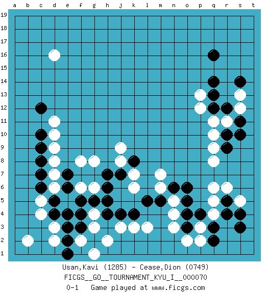 Last move : 0-1 2018 March 27 12:41:49 [Event "FICGS__GO__TOURNAMENT_KYU_I__000070"] [Site "FICGS"] [Date "2017.11.29"] [Round "1"] [Black "Usan,Kavi"] [White "Cease,Dion"] [Result "0-1"] [Rating 1 "1285"] [Rating 2 "0749"] 1.q16 d16 2.q3 d3 3.r9 n3 4.d5 q5 5.r5 r6 6.r4 q6 7.o4 p3 8.o3 p2 9.q2 o2 10.p4 q4 11.s3 n4 12.o5 n5 13.o6 q8 14.n6 q9 15.r10 s5 16.s4 q10 17.r12 q11 18.q12 r11 19.s11 p12 20.q13 p13 21.q14 s12 22.s10 s13 23.s14 m6 24.m5 m7 25.l5 l3 26.k4 k3 27.j4 j3 28.f4 k7 29.h4 f2 30.g2 g3 31.f3 h2 32.e2 g1 33.e3 d2 34.e1 c5 35.d4 c4 36.c6 d6 37.c7 b2 38.e6 g4 39.g5 g6 40.h5 f6 41.f5 d7 42.e7 d8 43.c8 d9 44.c9 d10 45.c10 d11 46.c12 f8 47.h7 e5 48.e4 g8 49.j7 j9 50.k8 k6 51.h6 j8 0-1 Here are the names of the openings (joseki) played in the four corners : Corner d4 : d3 d5 Komoku (Somok, Xiao~mu`) 3-4 Point. The komoku (3-4) point is the traditional corner enclosure move.. Ikken Takagakari (Hankan Nop'dakeolch'im, Yi Gaogua`jiao~, 1-Space High Approach). The 5-4 approach move has become more popular in modern times, as modern Go emphasizes speed and influence. Player White won this Go (weiqi, baduk) game. Follow this game move after move (download)Studying go is a wonderful way to develop both the creative as well as the logical abilities of children because to play it both sides of the brain are necessary. (Cho Chikun) Quotation,n.: The act of repeating erroneously the words of another. The words erroneously repeated. (Ambrose Bierce, The Devil's Dictionary)