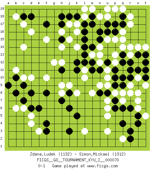 Last move : 0-1 2018 May 4 7:26:50 [Event "FICGS__GO__TOURNAMENT_KYU_I__000070"] [Site "FICGS"] [Date "2017.11.29"] [Round "1"] [Black "Zdana,Ludek"] [White "Simon,Mickael"] [Result "0-1"] [Rating 1 "1132"] [Rating 2 "1312"] 1.q17 d4 2.q4 d16 3.r11 o3 4.q6 q2 5.r3 l3 6.l16 d10 7.f3 e3 8.f4 c6 9.j3 o5 10.r2 q15 11.p16 p15 12.o16 o15 13.p9 r17 14.k5 r18 15.q18 q16 16.n16 r13 17.f17 c14 18.d18 c17 19.c18 f15 20.d8 j17 21.h18 j15 22.n15 o7 23.f8 f10 24.c7 b6 25.d6 d5 26.e6 l18 27.m17 n14 28.m14 n13 29.l15 q8 30.q9 q7 31.r6 s8 32.s9 r9 33.r10 r8 34.q12 s10 35.s11 t9 36.p6 o6 37.p7 p8 38.o8 o9 39.n8 o10 40.q10 s6 41.s5 s7 42.n11 o11 43.o12 n12 44.p11 m8 45.m11 n9 46.m12 m13 47.l13 p13 48.s13 s14 49.q13 q14 50.r12 r14 51.t12 p12 52.p10 h9 53.j8 h8 54.h7 j9 55.j6 o18 56.o17 q19 57.p17 p19 58.k12 h12 59.b10 b9 60.c9 c10 61.b8 b11 62.a9 k14 63.l14 l11 64.k11 l10 65.l12 n18 66.m18 m19 67.k18 k17 68.l17 l19 69.j18 t14 70.t13 t11 71.t10 t5 72.s4 t11 73.n19 o19 74.t10 k8 75.t11 b18 76.h15 h14 77.j16 h16 78.h17 k16 79.h11 g12 0-1 Here are the names of the openings (joseki) played in the four corners : Corner q4 : q4 o3 Hoshi (Hwajeom, Seongjeom, Xingwei`) 4-4 Point. The star or hoshi (4-4) point, emphasizing influence at the potential expense of territory. Ikken Kakari (Hankan Keolch'im, Yi Gua`jiao~, 1-Space Low Approach). White 2 is the standard approach move to the 4-4. Corner d4 : d4 f3 Hoshi (Hwajeom, Seongjeom, Xingwei`) 4-4 Point. The star or hoshi (4-4) point, emphasizing influence at the potential expense of territory. Ikken Kakari (Hankan Keolch'im, Yi Gua`jiao~, 1-Space Low Approach). Black 2 is the standard approach move to the 4-4. Corner d16 : d16 f17 Hoshi (Hwajeom, Seongjeom, Xingwei`) 4-4 Point. The star or hoshi (4-4) point, emphasizing influence at the potential expense of territory. Ikken Kakari (Hankan Keolch'im, Yi Gua`jiao~, 1-Space Low Approach). Black 2 is the standard approach move to the 4-4. Player White won this Go (weiqi, baduk) game. Follow this game move after move (download)There is damezumari at the bamboo joint. (Anonymous) A mistake is only a mistake if you let it happen twice. Otherwise it is a learning experience. (Daniel Parmet)