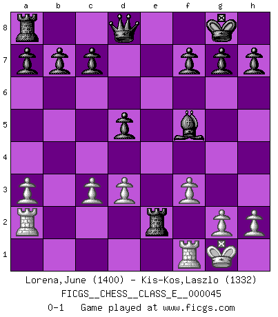 Last move : 0-1 2007 May 18 6:8:55 [Event "FICGS__CHESS__CLASS_E__000045"] [Site "FICGS"] [Date "2007.04.17"] [Round "1"] [White "Lorena,June"] [Black "Kis-Kos,Laszlo"] [Result "0-1"] [WhiteElo "1400"] [BlackElo "1332"] 1.d4 Nf6 2.Nc3 e6 3.Bf4 Bb4 4.a3 Bxc3+ 5.bxc3 d5 6.e4 Nxe4 7.Qd3 Nc6 8.f3 Nd6 9.Ne2 Nc4 10.Ra2 O-O 11.Ng3 e5 12.dxe5 Re8 13.Nf5 N6xe5 14.Bxe5 Nxe5 15.Be2 Nxd3+ 16.cxd3 Bxf5 17.O-O Rxe2 0-1 Queen's pawn game Kingside Castling by player Black (move 10) Kingside Castling by player White (move 17) Player Black won this chess game. Follow this game move after move (download)When you absolutely don't know what to do anymore, it is time to panic. (John van der Wiel) Man wirke der falschen Auffassung entgegen, als ob jeder Zug Unmittelbares zu leisten habe; auch Werte- und Ruhezüge haben ihre Existenzberechtigung. (Aaron Nimzowitsch) Yo he agregado estos principios a la ley: pongan los Caballos en acción antes de que los dos Alfiles sean desarrollados. (Emanuel Lasker) Psychologiquement, tu dois avoir confiance en toi même, mais cette confiance doit être basée sur des faits. (Robert Fischer) Excelling at chess has long been considered a symbol of more general intelligence. That is an incorrect assumption in my view, as pleasant as it might be. But for the purposes of argument and investigation, chess is, in Russkin-Gutman's words, 'an unparalleled laboratory, since both the learning process and the degree of ability obtained can be objectified and quantified, providing an excellent comparative framework on which to use rigorous analytical techniques.' (The Chess Master and the Computer, by Garry Kasparov - 2010)