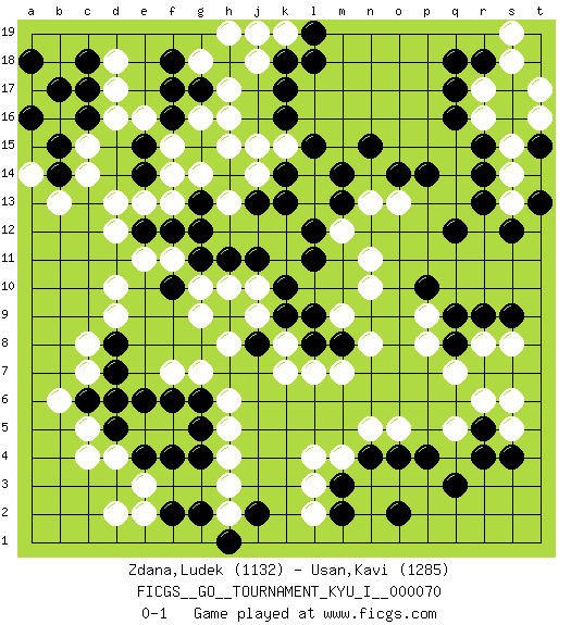 Last move : 0-1 2018 April 18 20:49:33 [Event "FICGS__GO__TOURNAMENT_KYU_I__000070"] [Site "FICGS"] [Date "2017.11.29"] [Round "1"] [Black "Zdana,Ludek"] [White "Usan,Kavi"] [Result "0-1"] [Rating 1 "1132"] [Rating 2 "1285"] 1.q16 d4 2.q3 d16 3.r9 d10 4.k16 l4 5.n4 h4 6.c17 d17 7.c16 c15 8.b15 c14 9.b14 b13 10.c18 d13 11.f17 d18 12.a18 a14 13.a16 r17 14.q17 r16 15.r15 s15 16.r14 s14 17.r13 s13 18.c6 c8 19.e6 c5 20.f4 b6 21.d5 c4 22.e4 c7 23.d6 q5 24.r4 q7 25.r5 r6 26.n15 r8 27.q9 n5 28.p4 o5 29.o4 m4 30.m3 l3 31.m2 l2 32.o2 h17 33.g15 h15 34.k17 g16 35.f16 f15 36.h18 j18 37.g17 h16 38.e15 f14 39.k18 g18 40.f18 h19 41.e14 e16 42.b17 e13 43.k13 h13 44.r18 s18 45.q18 g7 46.f2 d2 47.g6 f7 48.f6 m12 49.s12 s19 50.t13 t17 51.q12 h2 52.g4 h5 53.g5 h6 54.g2 e3 55.j2 h3 56.l11 n10 57.l12 n11 58.m13 n13 59.m14 n8 60.j8 h8 61.h9 j9 62.k9 j10 63.k10 k8 64.j11 h10 65.l8 k7 66.h11 g10 67.g11 f11 68.f10 g9 69.f12 e11 70.g13 g14 71.e12 d12 72.j13 f13 73.g12 l7 74.o14 k19 75.l19 j19 76.l18 o13 77.h1 e2 78.m8 m9 79.l9 m7 80.p14 p8 81.q8 p9 82.p10 s8 83.s9 s5 84.s4 s6 85.t15 t16 86.d8 d9 87.d7 j14 88.k14 k15 89.l15 j15 0-1 Here are the names of the openings (joseki) played in the four corners : Corner d16 : d16 c17 Hoshi (Hwajeom, Seongjeom, Xingwei`) 4-4 Point. The star or hoshi (4-4) point, emphasizing influence at the potential expense of territory. Corner q16 : q16 r17 Hoshi (Hwajeom, Seongjeom, Xingwei`) 4-4 Point. The star or hoshi (4-4) point, emphasizing influence at the potential expense of territory. Player White won this Go (weiqi, baduk) game. Follow this game move after move (download)Answer the keima with a kosumi. (Anonymous) 98% of all statistics are made up. (Author unknown)