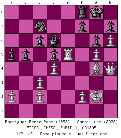 Last move : 1/2-1/2 2018 March 22 10:25:18 [Event "FICGS__CHESS__RAPID_A__000205"] [Site "FICGS"] [Date "2017.11.30"] [Round "1"] [White "Rodriguez Perez,Rene"] [Black "Sorbi,Luca"] [Result "1/2-1/2"] [WhiteElo "1952"] [BlackElo "2028"] 1.e4 e5 2.Nf3 Nf6 3.Nxe5 d6 4.Nf3 Nxe4 5.d4 d5 6.Bd3 Nc6 7.O-O Be7 8.Nc3 Nxc3 9.bxc3 Bg4 10.Re1 O-O 11.Bf4 Bd6 12.Bxd6 Bxf3 13.Qxf3 Qxd6 14.Re3 Rae8 15.Rae1 Rxe3 16.Rxe3 g6 17.h4 Nb8 18.h5 Nd7 19.g4 Nf6 20.h6 c6 21.Kg2 b5 22.Qg3 Qd7 23.Bf5 Qd8 24.g5 Nh5 25.Qh4 Qd6 26.Bg4 Nf4+ 27.Kf1 Ne6 28.Re5 Nc7 29.Kg2 a5 1/2-1/2 Petrov : Classical attack Kingside Castling by player White (move 7) Kingside Castling by player Black (move 10) This chess game ended in a draw. Follow this game move after move (download)The Pawns are the soul of the game. (Francois Andre Danican Philidor) Ich rechne überhaupt nicht voraus. Ich gewinne auch so. (Robert James Fischer) De todos mis libros Rusos, la defensa contiene y difunde el 'calor' mas grande que pudiese verse extraño al observar lo supremamente abstracto que el Ajedrez supuestamente es. (Vladimir Nabokov) Le système Elo représente seulement une moyenne. Il est simplement un indicateur de votre stabilité. (Anatoli Karpov) The quality of decision is like the well-timed swoop of a falcon which enables it to strike and destroy its victim. (Sun Tzu)